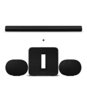 Herzstück des Sets bildet die Sonos Arc Ultra, die als Dolby-Atmos-Soundbar samt Upfiring-Speaker Töne an die Decke wirft und von dort zu dir reflektiert. So entsteht der dreidimensionale Klang samt Höheninformationen. Die Sonos Era 300 als Rear-Lautsprecher sind dabei die perfekte Ergänzung: Sie haben ebenfalls Treiber, die nach oben, aber auch seitlich abstrahlen, und so der Arc Ultra unter die Arme greifen. Dann noch der Sonos Sub 4, welcher Dual-Force-Canceling-Woofers einsetzt und für die Extraportion Bass sorgt. Natürlich funktioniert das alles bis auf die Stromkabel drahtlos, denn Sonos verfügt über eines der beliebtesten Multiroom-Systeme am Markt.