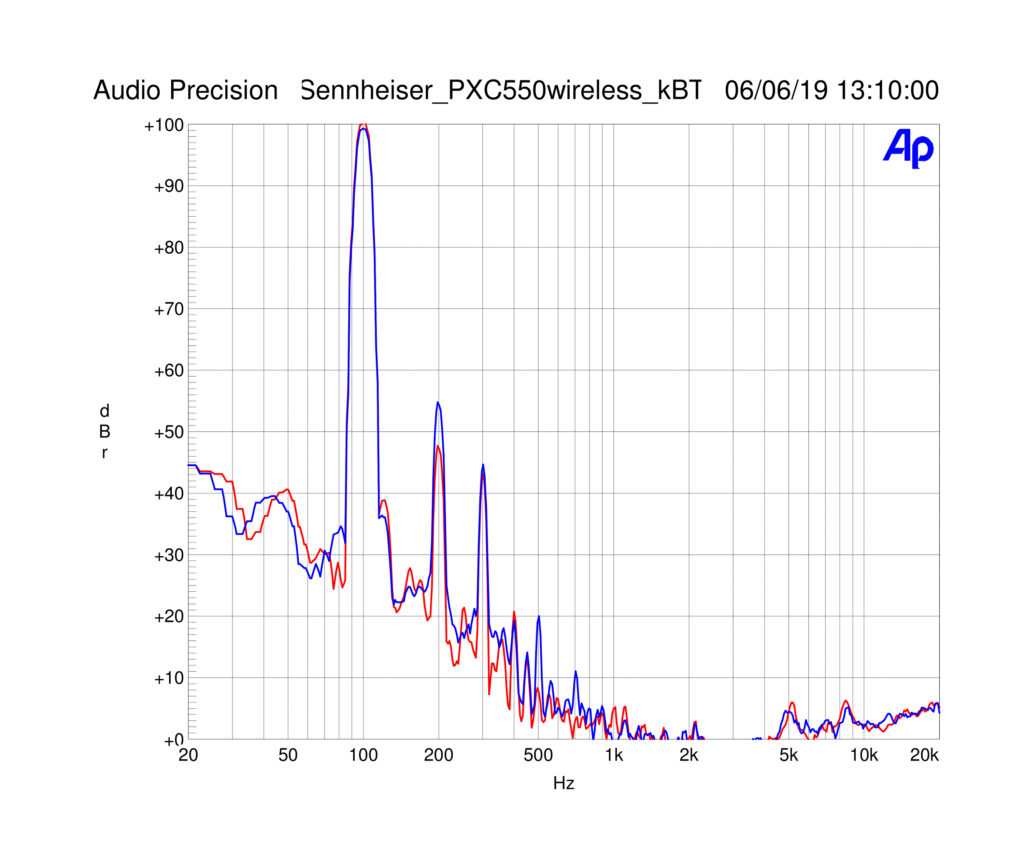 Distortione Spectrum 100Hz, 100dB SPL, L&R, Bluetooth, NC-off | Kommentar: Im Bluetooth-Betrieb steigen die Verzerrungen merklich an, besonders im Linken Kanal. Klirrfaktor (gemittelt) rund 0,5 Prozent. | Messergebnisse von Peter Schüller