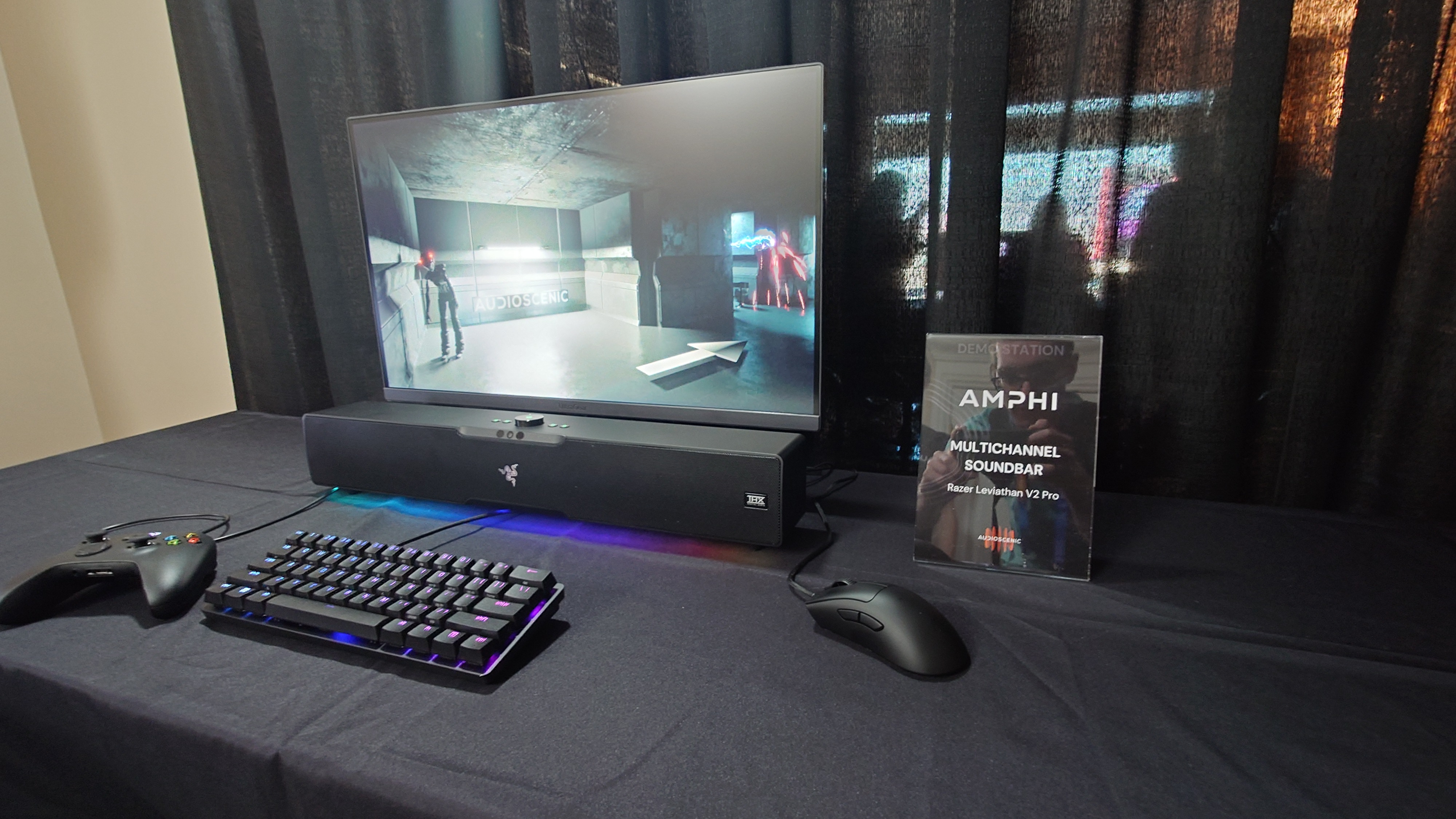 Auf der CES 2025 hat uns Audioscenic in einer Suite verschiedenste Produkte gezeigt, die mittels Amphi dreidimensionalen Sound liefern sollten – und konnten. Dazu aber später mehr. So konnten wir ein paar Laptops bestaunen, ebenso wie Monitore mit eingebauten Lautsprechern und eine Soundbar von Razer – genauer die Razer Leviathan V2 Pro Soundbar.