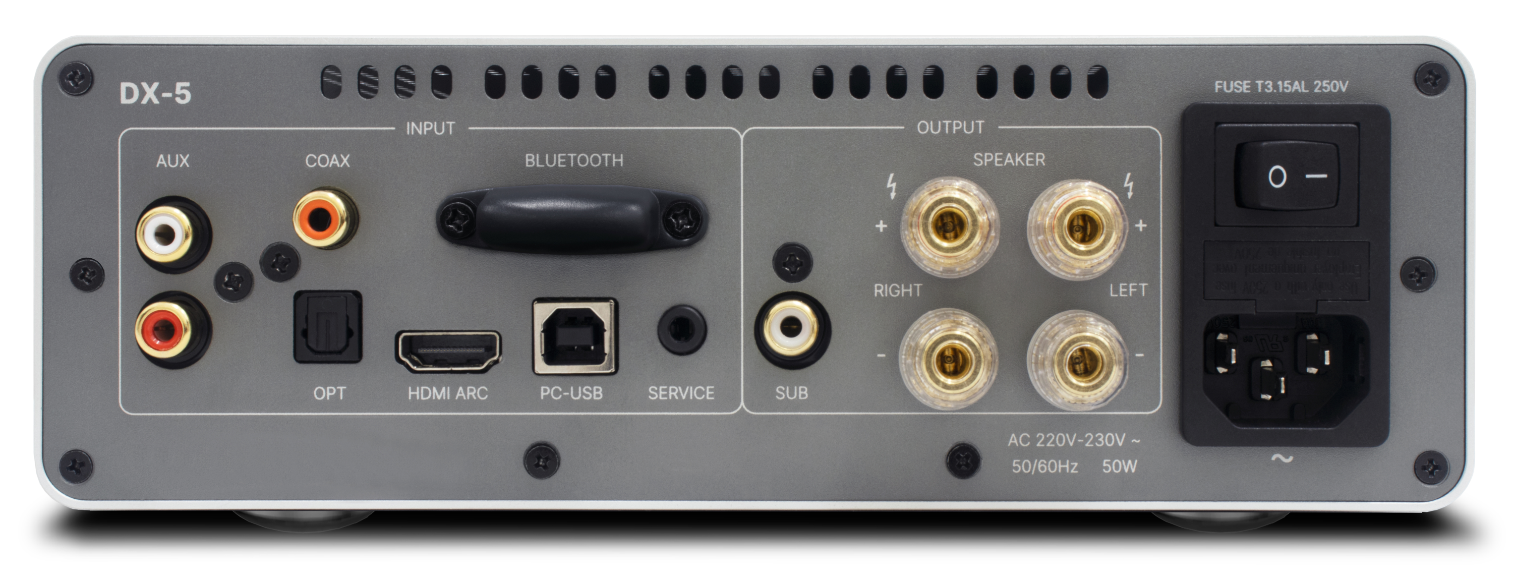 Das Datenblatt des Rotel DX-5 liest sich wie ein Stelldichein der wichtigsten Digital-Schnittstellen: Auf seiner Rückseite findest du alle Eingänge, die du für deine digitalen Musikquellen brauchst: Von klassischem Koax und TOSlink, über USB-B für deinen PC und Bluetooth mit aptX HD ist alles dabei. HDMI ARC ermöglicht dir zudem, deinen Fernseher anzuschließen und die Lautstärke des DX-5 beim Filmschauen über die TV-Fernbedienung anzupassen. Als DAC kommt ein ESS ES9039Q2M zum Einsatz, der sich um Signale mit Auflösungen bis hinauf zu 384 kHz / 32 Bit und DSD256 kümmern kann.