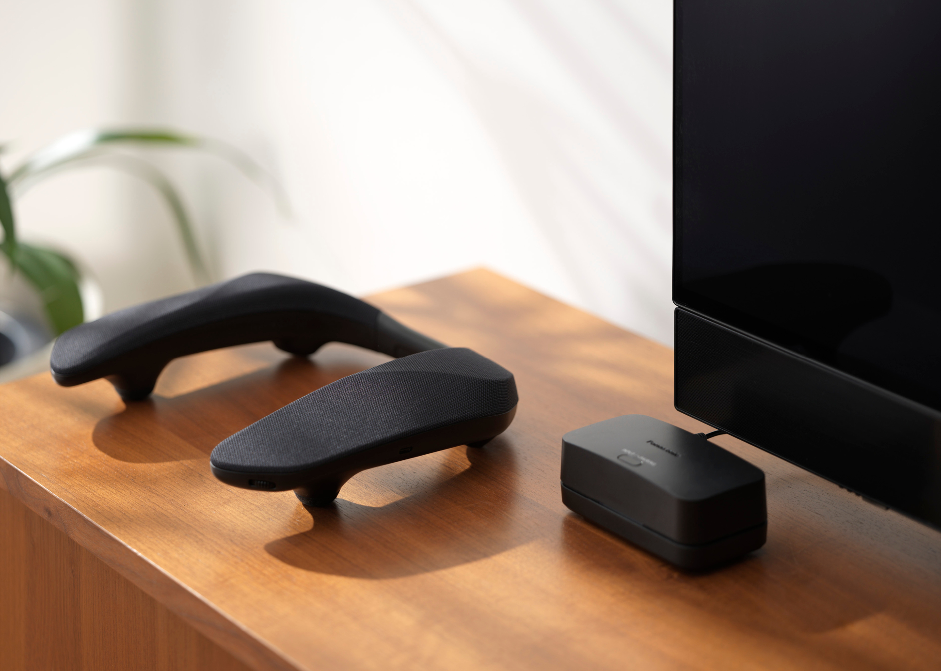 Der Sender: Das ist eine kleine Funkstation, die dem Panasonic SC-GNW30 beiliegt. Sie ist die Hauptzentrale, die alles Audio verwaltet – und dann doch ein paar Kabel ins Spiel bringt. Denn natürlich muss der Ton erst einmal vom Spiel zum Sender. Zockst du am Rechner, passiert das über ein USB-C-Kabel. Konsolenspieler verbinden Playstation, Xbox oder Nintendo Switch per HDMI-Kabel. Da du aber frei entscheiden kannst, wo du die Box platzierst, dürften die Kabel nicht allzu viel stören. Die Box ist mit ihren elf Zentimetern Breite und vier Zentimetern Höhe auch sehr einfach zu verstecken.