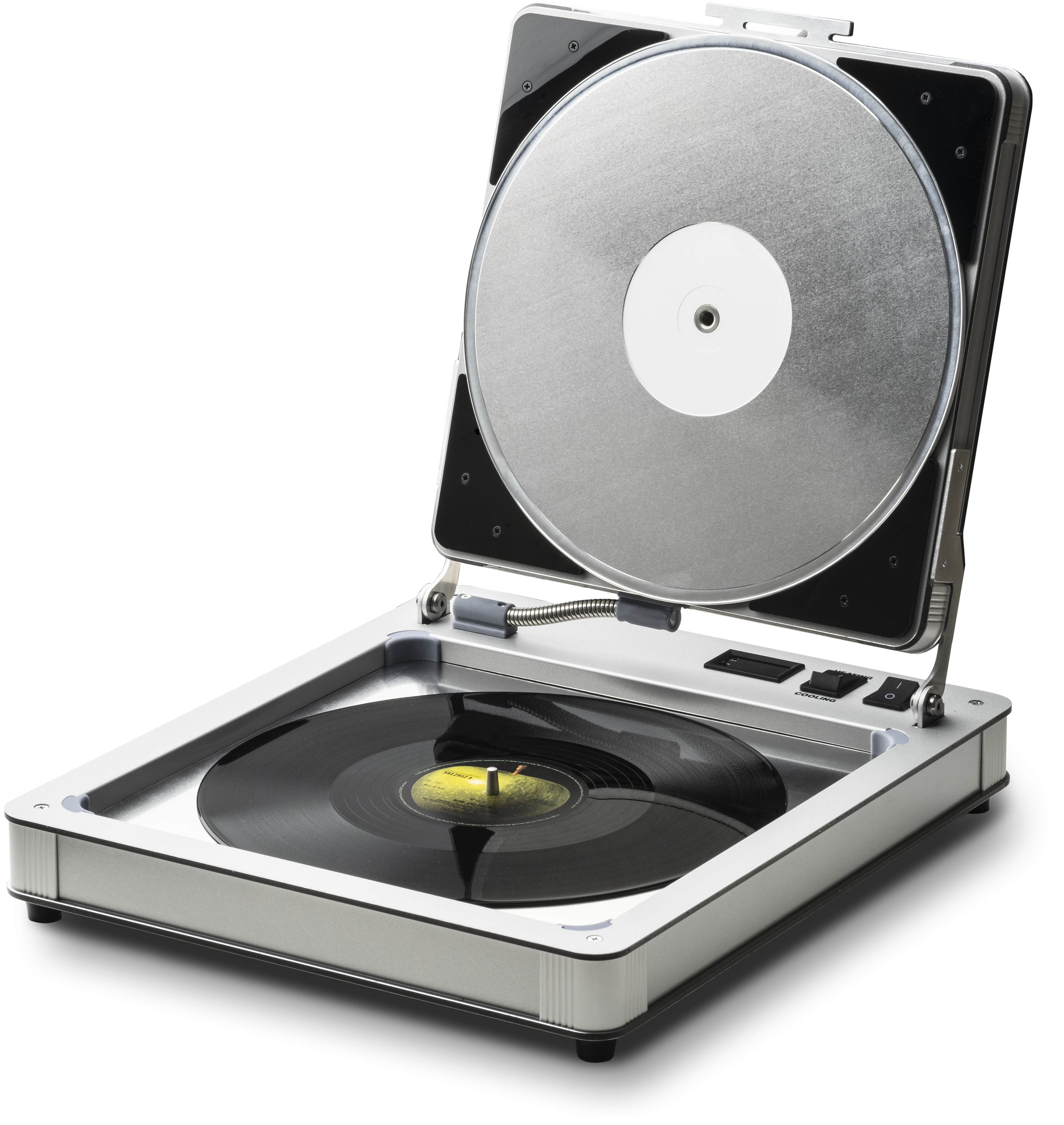 Der Pro-Ject Flatten it funktioniert ähnlich wie ein Waffeleisen – mit dem Unterschied, dass die beiden beheizten Alu-Platten kein neues Muster in dein Platten pressen, sondern das Vinyl selbst in die gewollte Form bringen. Keine Sorge: Der Musikinformation soll nichts passieren, da sie an den Innenseiten der Rille liegt – die Alu-Scheiben erreichen sie also erst gar nicht. Das Prinzip gibt es nicht erst seit gestern und hat sich bewährt – wenn auch normalerweise für einen deutlich höheren Preis. Denn Vinyl ist ein empfindlicher Rohstoff. Um deinen Schallplatten nicht zu schaden, muss die Temperatur langsam und gleichmäßig erhöht – und genauso vorsichtig wieder abgesenkt werden.
