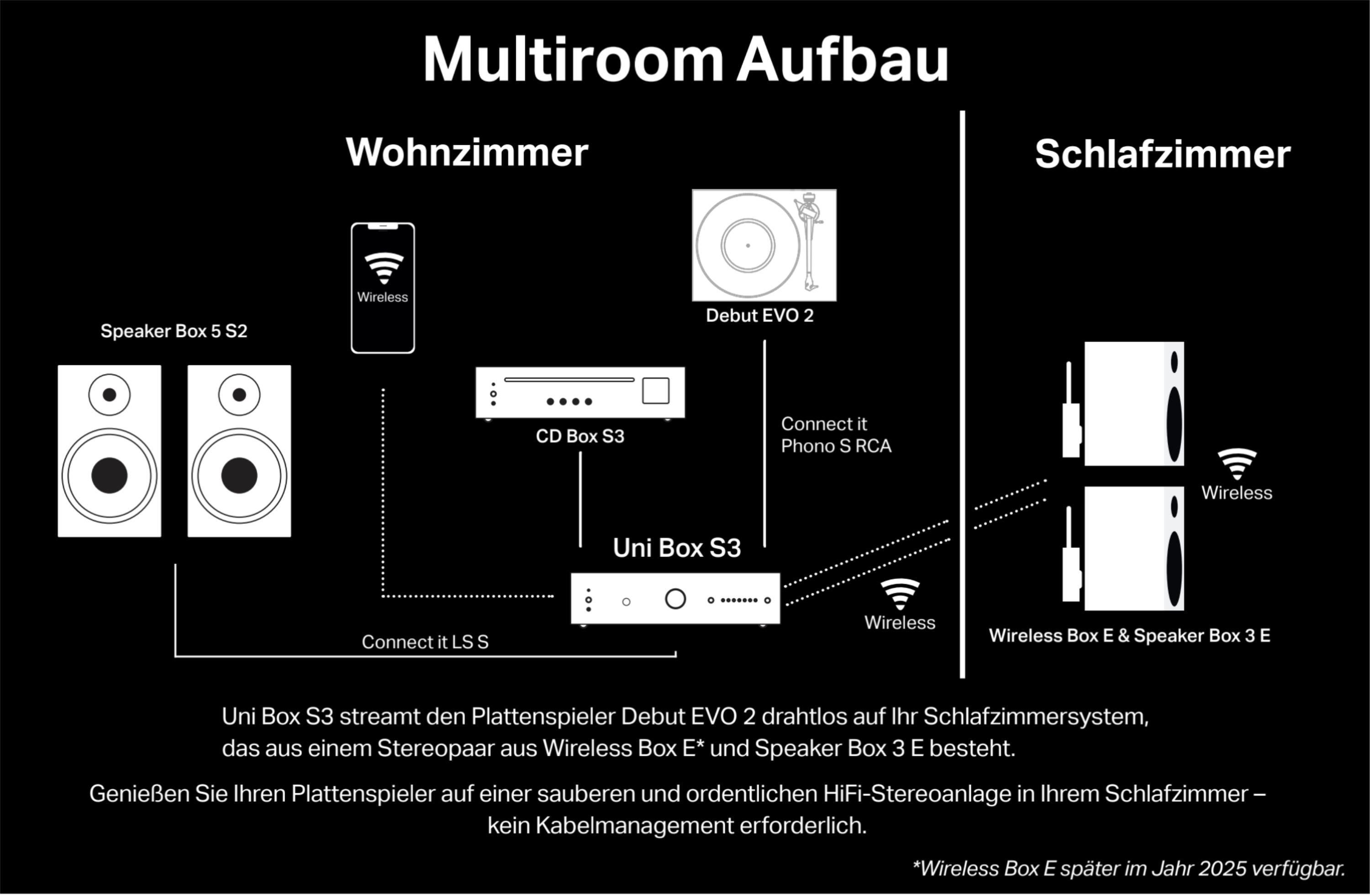 Streamer, an die du Audio streamen kannst, sind die Stream Box E und Stream Box S3 sowie die Wireless Box E. Letztere soll laut Pro-Ject „ab 2025 verfügbar“ sein.