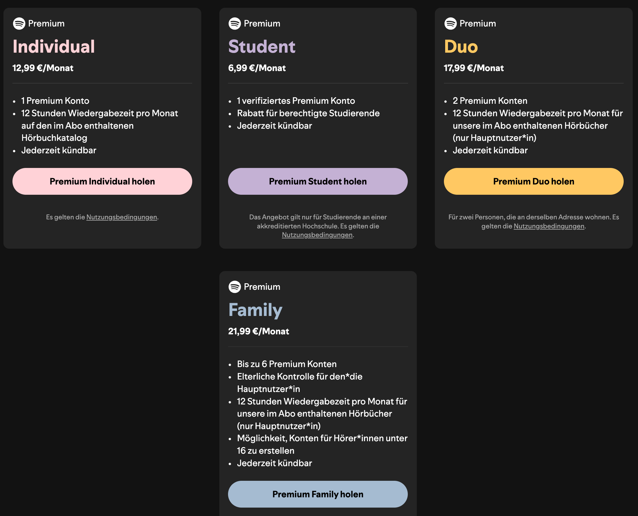 In den USA sieht es jedenfalls folgendermaßen aus: Der Preis für das Single-Abo steigt von 11,99 auf 12,99 US-Dollar im Monat. Das Duo-Abo für Paare verteuert sich von 16,99 auf 18,99 Euro. Und das Familien-Abonnement für größere Haushalte kostet in den Vereinigten Staaten jetzt nicht mehr 19,99, sondern 21,99 Euro. Schließlich müssen auch Studierende mehr zahlen. Für jene erhöht sich der Preis von Spotify Premium von 5,99 auf 6,99 US-Dollar im Monat. Die neuen Preise greifen in den Vereinigten Staaten bereits ab der nächsten Abrechnung.