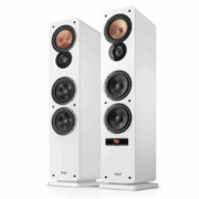 Wie du siehst, handelt es sich technisch größtenteils um dieselbe Box. Das zeigt sich auch bei den Treibern, die laut Datenblatt identisch sind: ein Hochtöner, ein Mitteltöner, zwei Tieftöner. Auf der Rückseite sitzen zwei Bassreflexrohre. In ihnen sitzen wieder Gitter, damit Kinder keine Gegenstände hineinwerfen können.