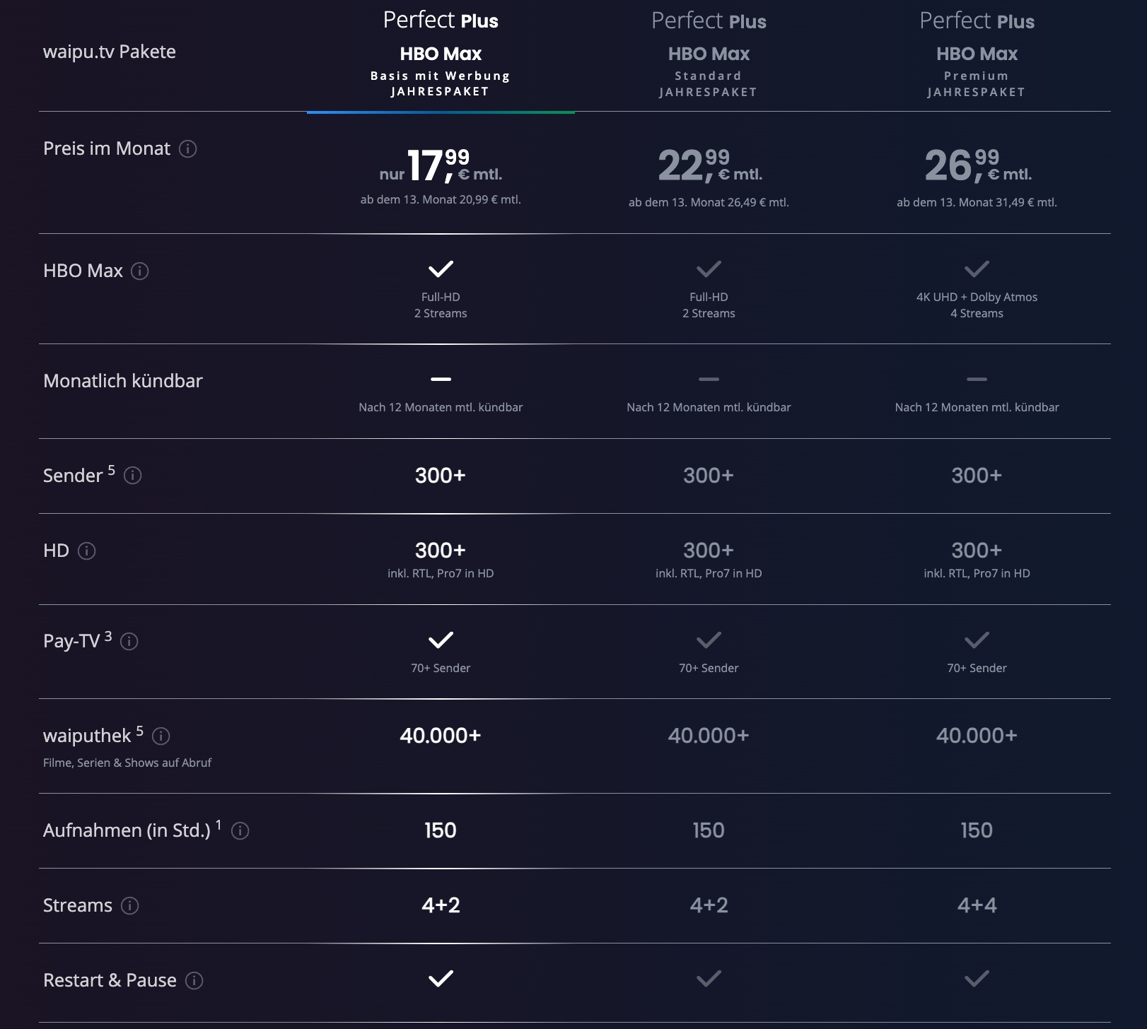 Ein Vorzug der Bundles von waipu.tv: Im Gegensatz zu RTL+ stehen hier auch Pakete mit HBO Max Premium zur Auswahl. Gerade bei den Jahrespaketen können sich erhebliche Ersparnisse gegenüber den Einzelbuchungen ergeben. Wichtig ist aber, dass gerade die Jahrespakete ab dem 13. Monat deutlich im Preis steigen. Da solltest du also an die rechtzeitige Kündigung denken. Die Jahrespakete beginnen ab 17,99 Euro im Monat, monatlich kündbare Bundles stehen ab 19,99 Euro zur Verfügung.