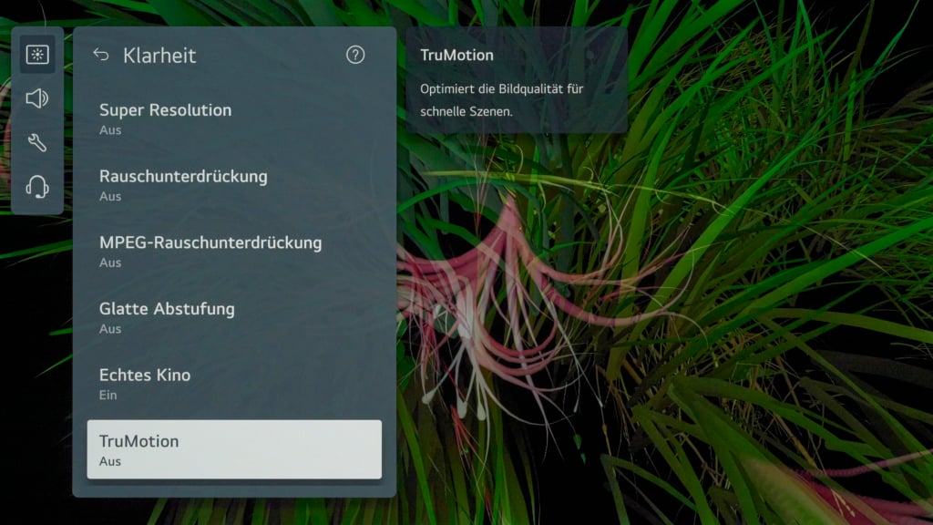 Mithilfe der LG-Bewegungsglättung TruMotion kannst du den ruckeligen Look von Kinofilmen und Bewegungsunschärfe reduzieren. Hier raten wir dir, die verschiedenen Einstellmöglichkeiten selber auszuprobieren und das zu wählen, was dir am meisten zusagt. Allgemein gilt: Je stärker geglättet wird, umso eher kommen auch Artefakte ins Bild.