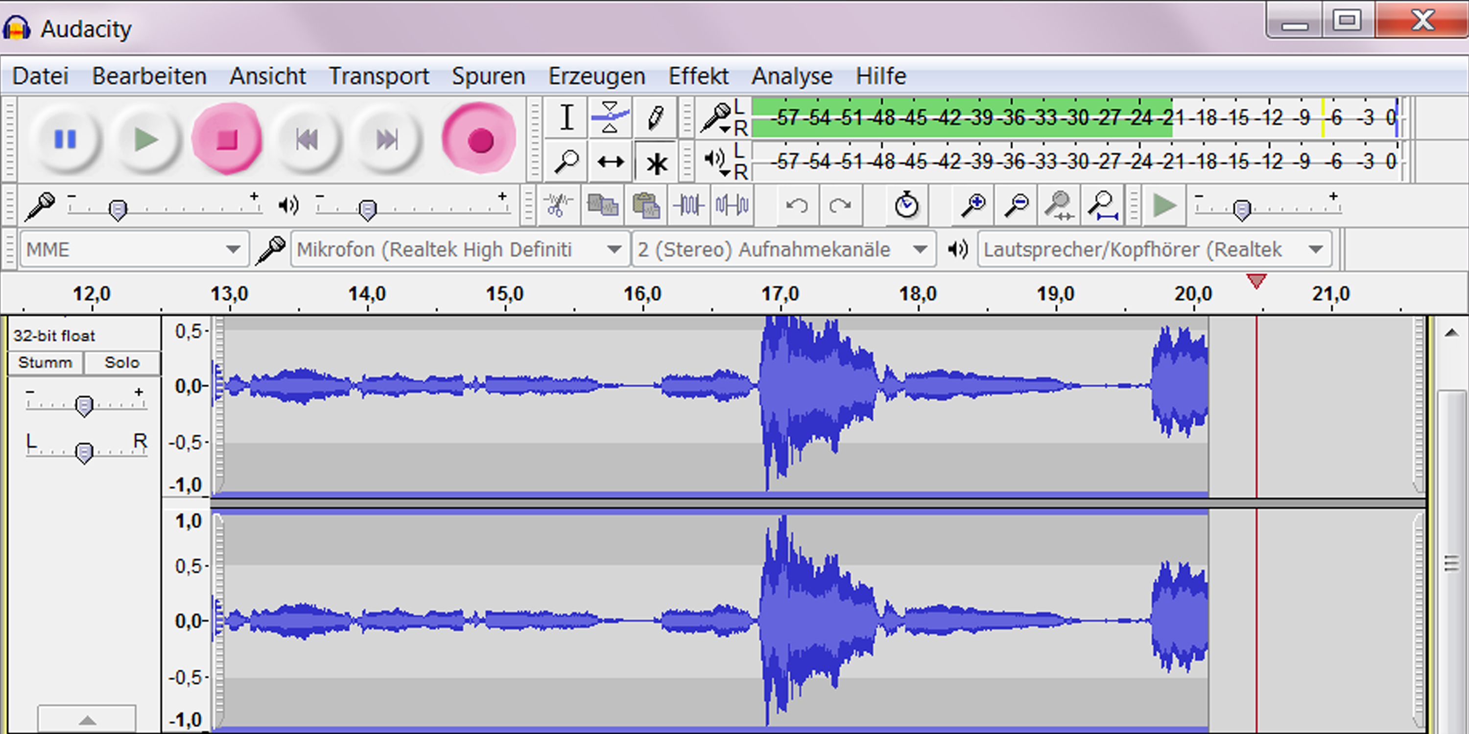 Bei Audacity solltest du nun in den Programmeinstellungen den A/D-Wandler für die Aufnahme auswählen und den Menüpunkt „Kanäle“ auf „Stereo“ stellen. Das gilt natürlich nur für in Stereo produzierte Alben. Alte Pressungen können teils auch in Mono aufgenommen sein. Aus dem linken und rechten Lautsprecher kommt also ohnehin dasselbe Signal. Hier kannst du also auch „Mono“ auswählen. Bietet der A/D-Wandler die Möglichkeit, den Pegel einzustellen, solltest du nun darauf achten, dass die lauteste Stelle der Platte kurz vor dem 0-dB-Wert steht.