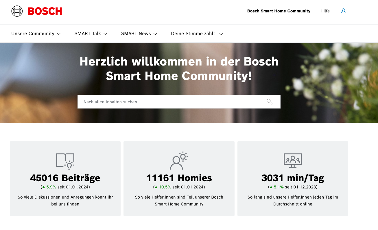 Bosch betreibt aus diesem Grund eine eigene Smart-Home-Community mit einem großen Forum sowie einer umfangreichen Frage- und Antworten-Sektion. Über 11.000 Nutzer:innen tauschen sich hier über die Smart-Home-Lösungen aus. Damit ist die Community auch eine hervorragende Anlaufstelle für mögliche Problemen bei der Einrichtung und Alltagsnutzung des Systems.
