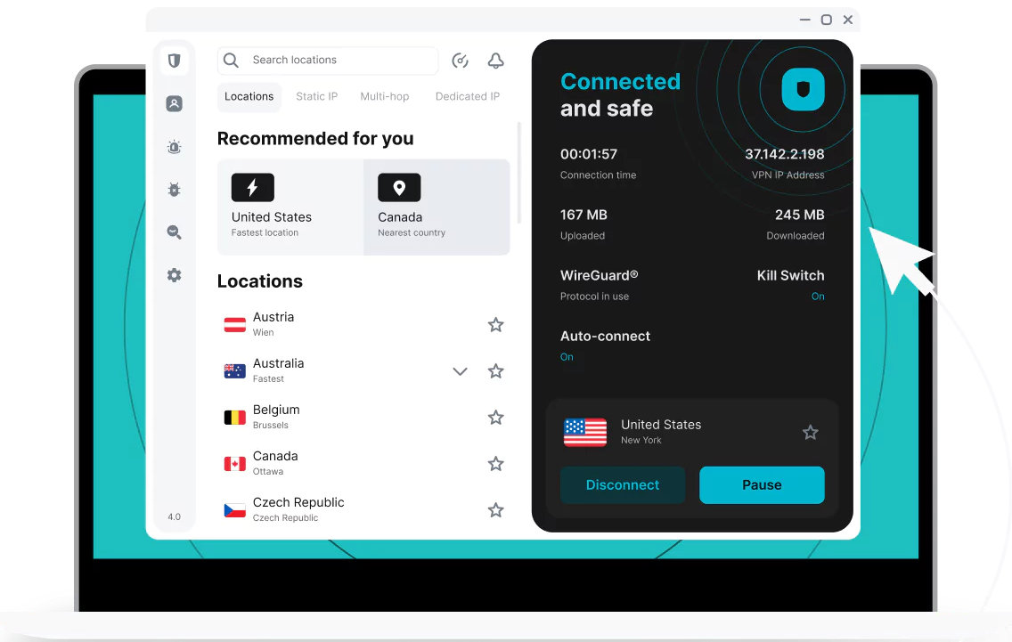 Dienstbasierte VPN-Clients erfordern von dir keinerlei technisches Vorwissen. Du schließt ein Abo ab, lädst die App des Anbieters auf dein Gerät herunter, gibst deine persönlichen Zugangsdaten ein – und mit nur einem Knopfdruck kann es auch schon losgehen. Die Anbieter versorgen die App laufend mit Updates und haben bei Problemen einen Kundendienst, an den du dich wenden kannst. Dazu bieten sie dir Zusatzfunktionen wie etwa einen „Kill Switch“ an. Der unterbricht für dich die Internetverbindung automatisch, sollte es einen Ausfall beim VPN-Dienst geben. So bleiben deine Daten stets sicher.