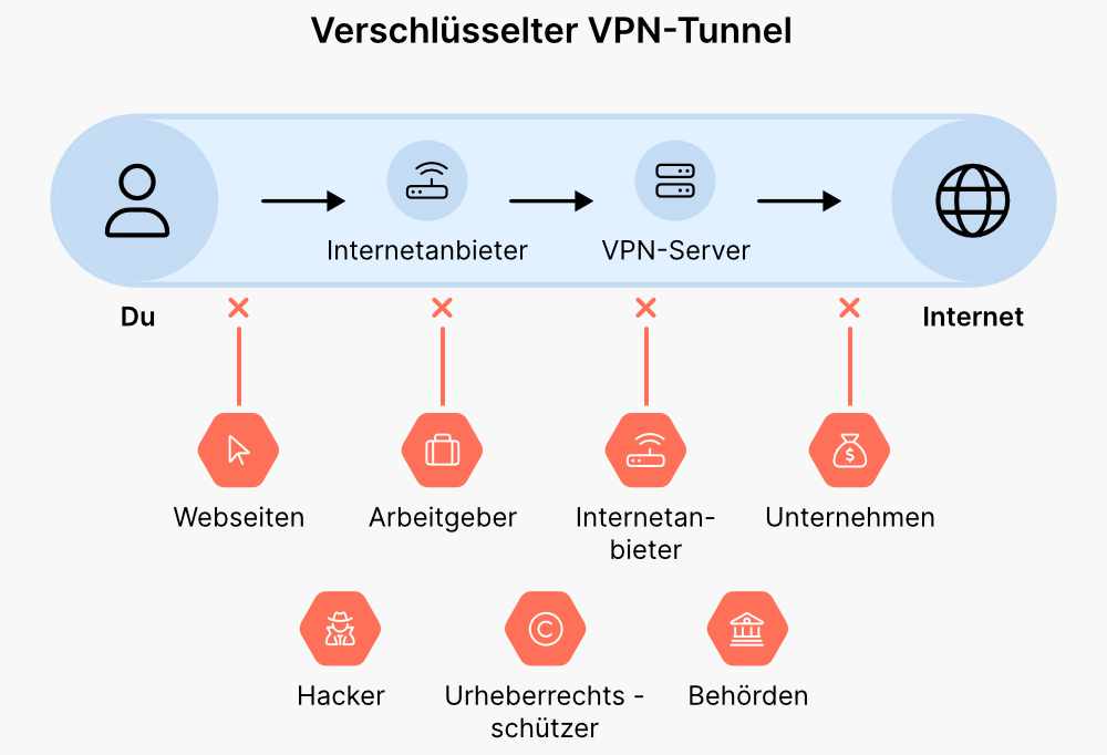Umgangssprachlich bezeichnet man die über den Client hergestellte Verbindung auch als VPN-Tunnel. Dieses Bild passt ganz gut, da deine Daten vor ungewünschten Blicken geschützt werden, solange du im Tunnel bleibst. Je nach Client kommen unterschiedliche Protokolle zum Einsatz, die Anonymität und Sicherheit gewährleisten sollen. Der Vorteil: Weder Websites noch Tracker können jetzt deine IP-Adresse, deinen wahren Standort oder andere persönliche Informationen über dich erkennen.