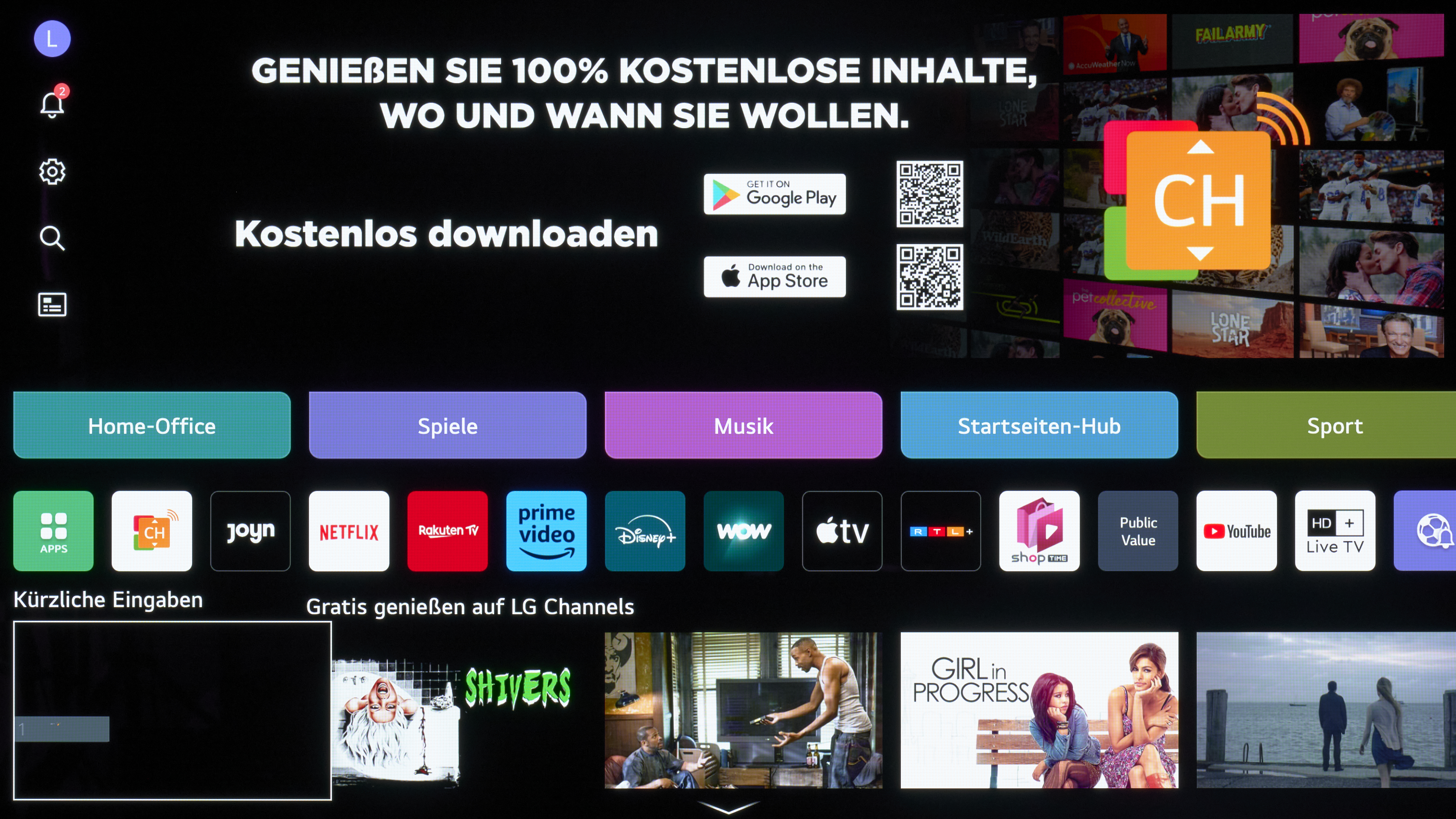 Weniger schön ist der vergleichsweise hohe Anteil an Werbung, den LG in seinem Smart-TV-System zulässt. So schlägt dir die Startseite auch jede Menge Inhalte von Streamingdiensten vor, die du gar nicht abonniert hast. Auch mit Hinweisen auf die diversen eigenen Film-, Serien- und App-Angebote von LG geizt das System leider nicht.