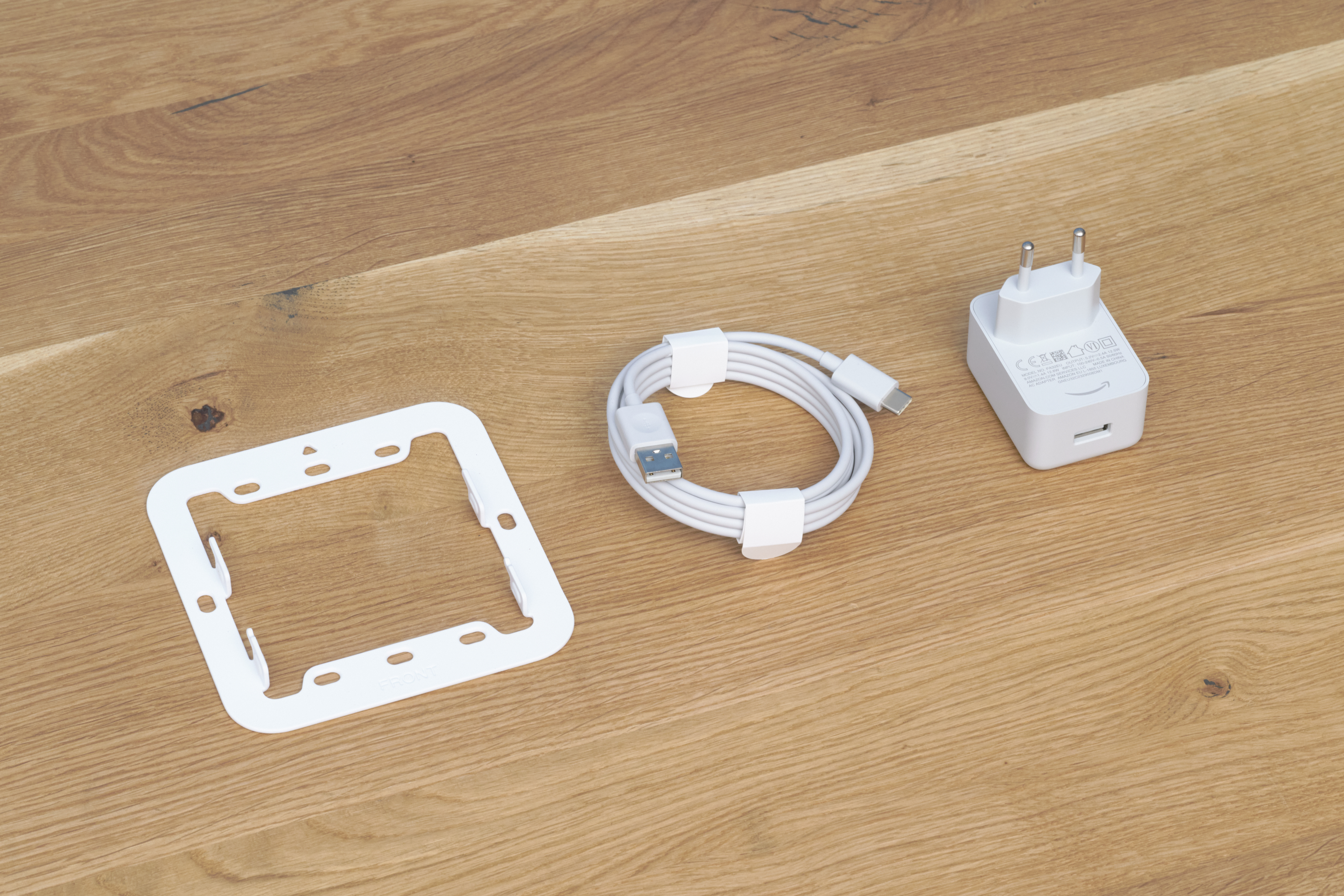 Im Lieferumfang ist eine Wandhalterung samt passenden Schrauben enthalten. Willst du den Echo Hub nicht aufhängen, bietet Amazon passende Aufsteller von Drittanbietern an. Rechts am Gehäuse findest du zwei Lautstärketasten sowie eine Taste zum Ein- oder Ausschalten der integrierten Mikrofone. Eine Kamera bietet der Echo Hub nicht. Stattdessen erkennt das Gerät auf Basis eines Infrarotsensors, wenn jemand in der Nähe ist und blendet die Bedienoberfläche ein.