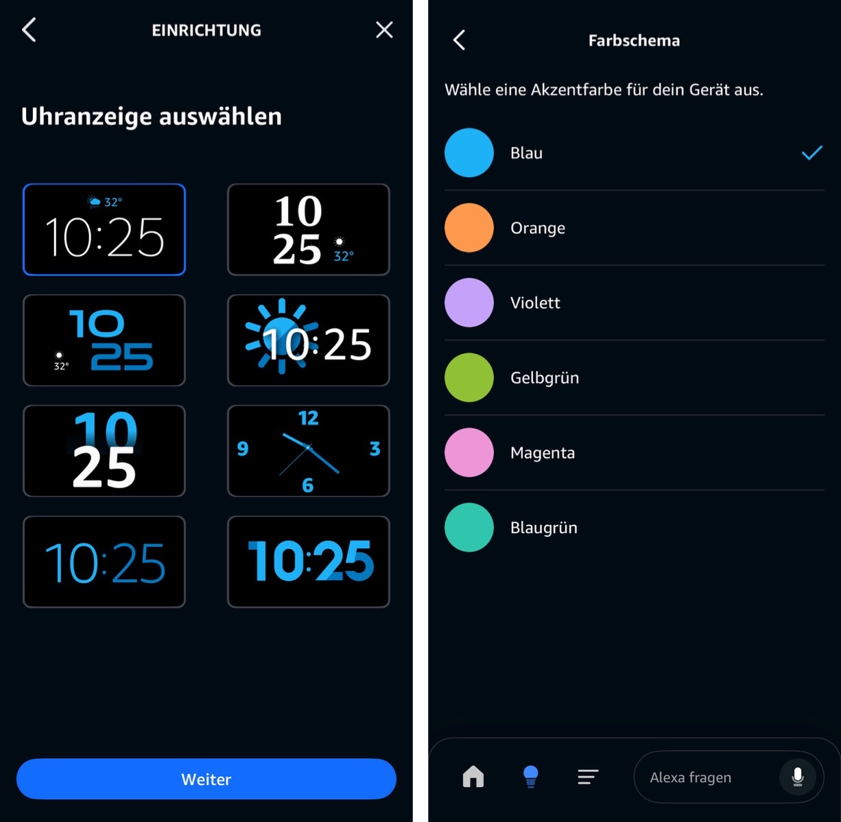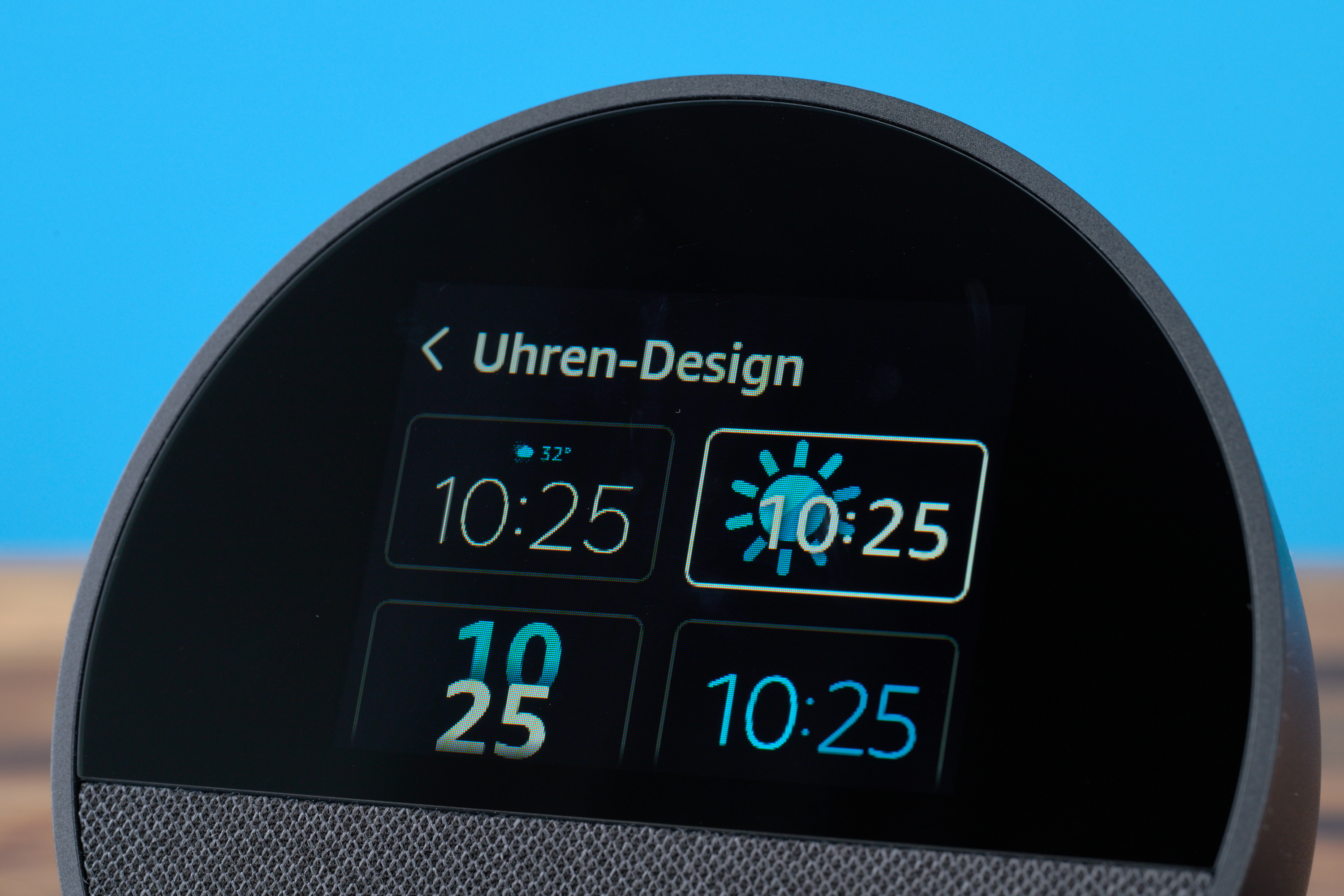 Der Echo Spot zeigt standardmäßig die Uhrzeit sowie das Wetter an. Die Optik passt du über die Alexa-App oder direkt am Gerät an. Neben einer Reihe von Designs für die Wetter- und Uhrzeit-Anzeige bietet Amazon auch die Auswahl aus verschiedenen Akzentfarben. Diese Farben dominieren dann die Uhrzeit und die kleinen Animationen, die beispielsweise bei der Wiedergabe von Musik ablaufen.