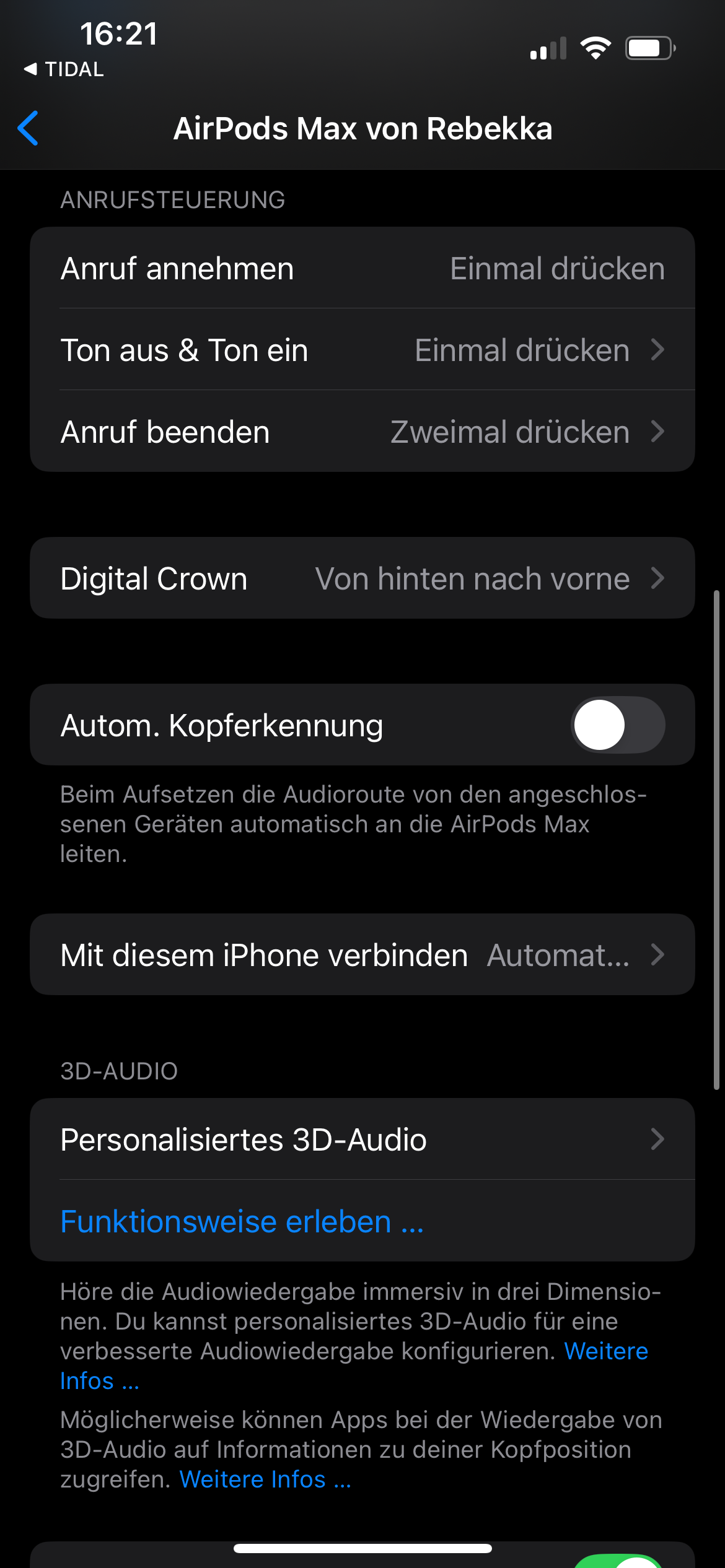 Bei der Bedienung zeigt der AirPods Max seine Präferenz für das Apple-Betriebssystem: Unter Android entfallen jegliche Einstellungsoptionen, die dir iOS bietet. Das liegt daran, dass Apple die Kopfhörer-Einstellungen in die Einstellungsmenüs des iPhones verfrachtet hat.