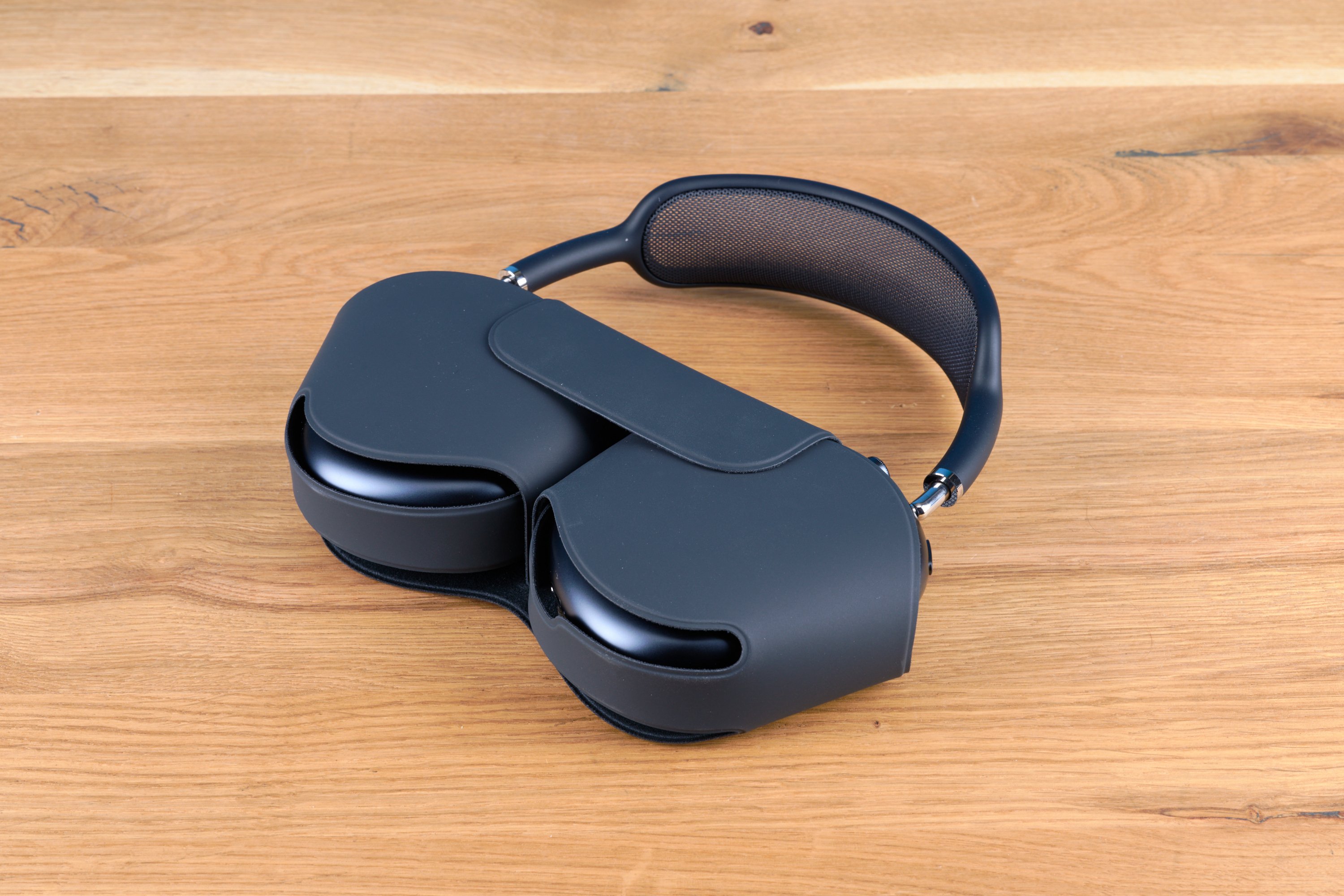 Auch abseits des Akkus ist der AirPods Max nur bedingt mobil. Zumindest scheint er nicht darauf ausgelegt zu sein, viel Zeit im Handgepäck zu verbringen. Er ist vergleichsweise schwer: Fast 390 Gramm wiegt er. Dem gegenüber steht z. B. der Bose QC Ultra mit 250 Gramm Gewicht. Zum anderen gibt es kein Hartschalen-Tragecase für den AirPods Max, das ihn in der Tasche schützen würde. Stattdessen bietet Apple dir nur das „Smart Case“: eine dünne Gummihülle, die kaum schützt. Du musst dir also gut überlegen, ob du Gehäuse und Elektronik im Wert von knapp 600 Euro lose zwischen Deoflasche und Pausenbrötchen hin- und herklappern lassen möchtest. Und selbst wenn ja, macht der AirPods Max es dir schwer, denn zusammenfalten lässt er sich nicht.