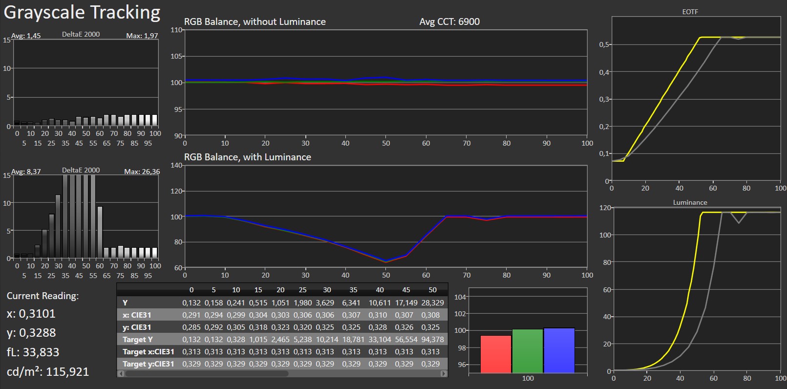 Vor allem bei alltäglichen Inhalten sind die Abweichungen mit einem durchschnittlichen Delta-E-Error von 1,3 so gering, dass selbst geübte Augen diese nicht wahrnehmen. Kombiniert mit dem Kontrastverhältnis von rund 500:1, das wir im Schachbrett-Test ermittelt haben, und einer Helligkeit von rund 117 Nits in SDR kann man getrost von einem Bild auf Referenzniveau sprechen. Und, nur mal zum Vergleich: Der Sony Bravia Projector 8, der deutlich teurer ausfällt, weicht bei den Farben etwas weiter ab und bietet einen Hauch weniger Kontrast.