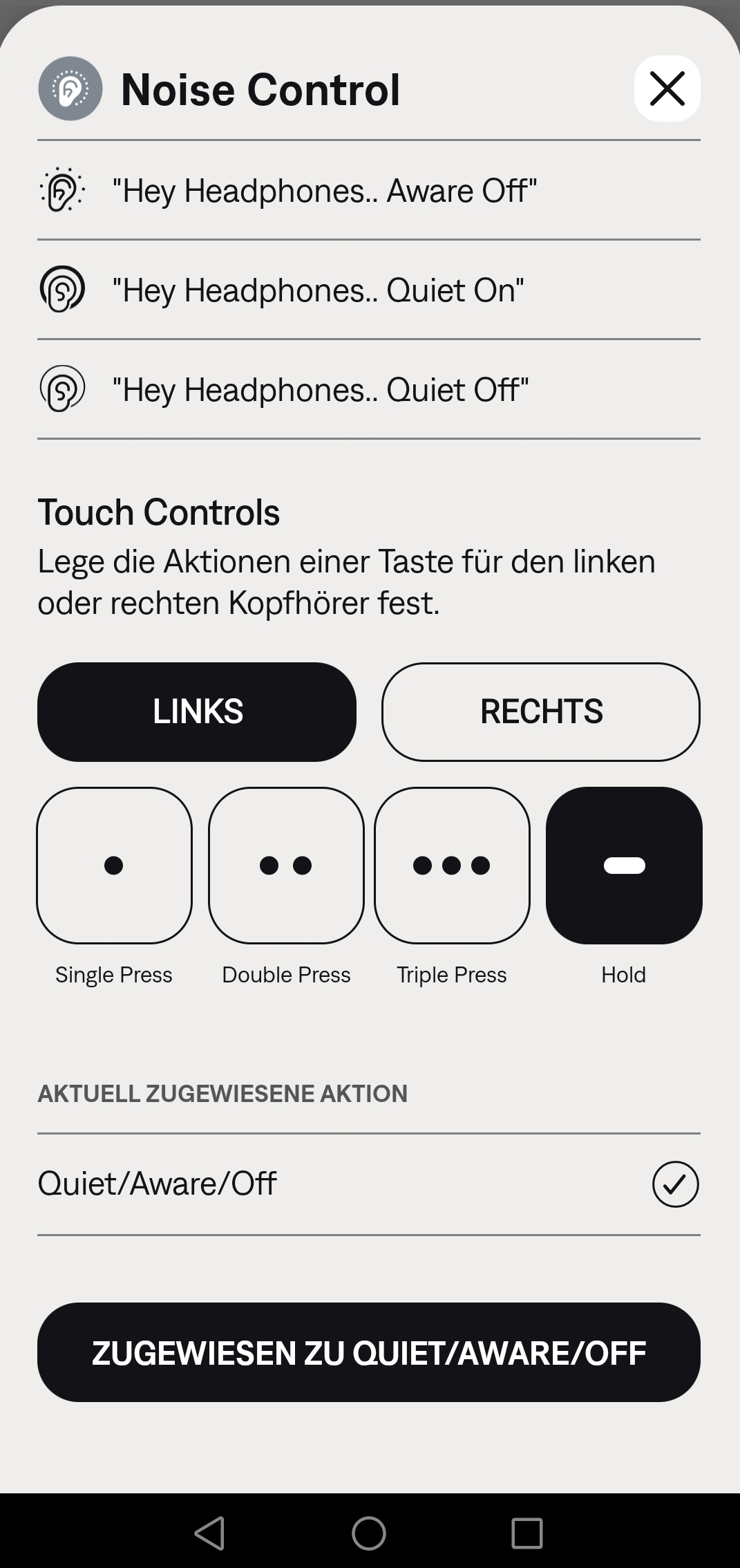 Sonst nehmen wir die neue App aber – besonders in Hinblick auf den Komfortfaktor – als deutliches Upgrade wahr. Das liegt unter anderem daran, dass jedes Unter-Menü auch direkt die Möglichkeit beherbergt, die Bedienung der Earbuds anzupassen. Du willst, dass einmaliges Drücken ANC aktiviert? Dann geht das sowohl über das ausführliche Menü zur Touch-Steuerung, als auch über das ANC-Menü.