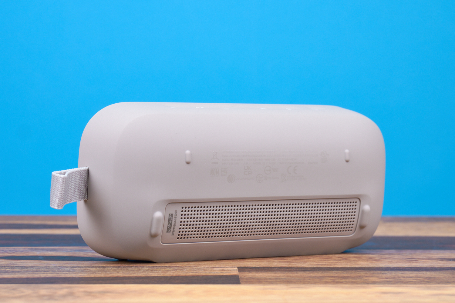 Das Gehäuse wird von gummiertem Kunststoff umschlossen, die Vorderseite von einem pulverbeschichteten Metallgitter geschützt. Ein weiteres Gitter befindet sich auf der Rückseite des Lautsprechers. Der Bose SoundLink Flex gehört zu den am besten verarbeiteten Lautsprechern seiner Klasse, was sich auch im Preis widerspiegelt. Auf der Rückseite findest du zudem vier Gummifüße, mit denen sich der Lautsprecher hinlegen lässt. Die integrierte „Position IQ“-Funktion passt in diesem Fall den Klang automatisch an.