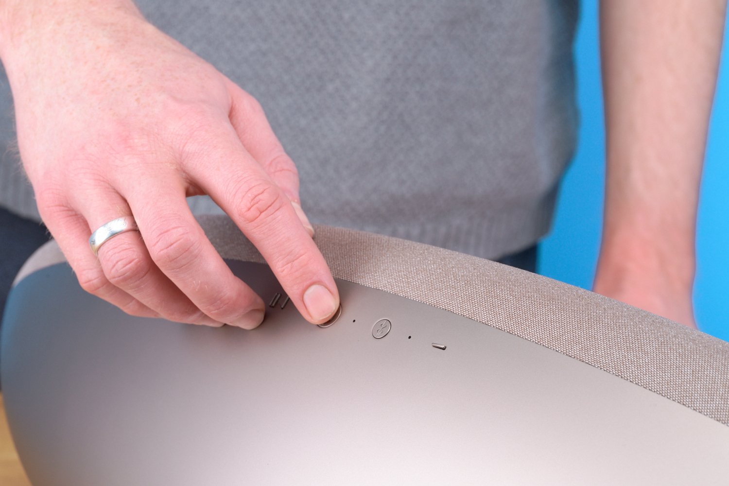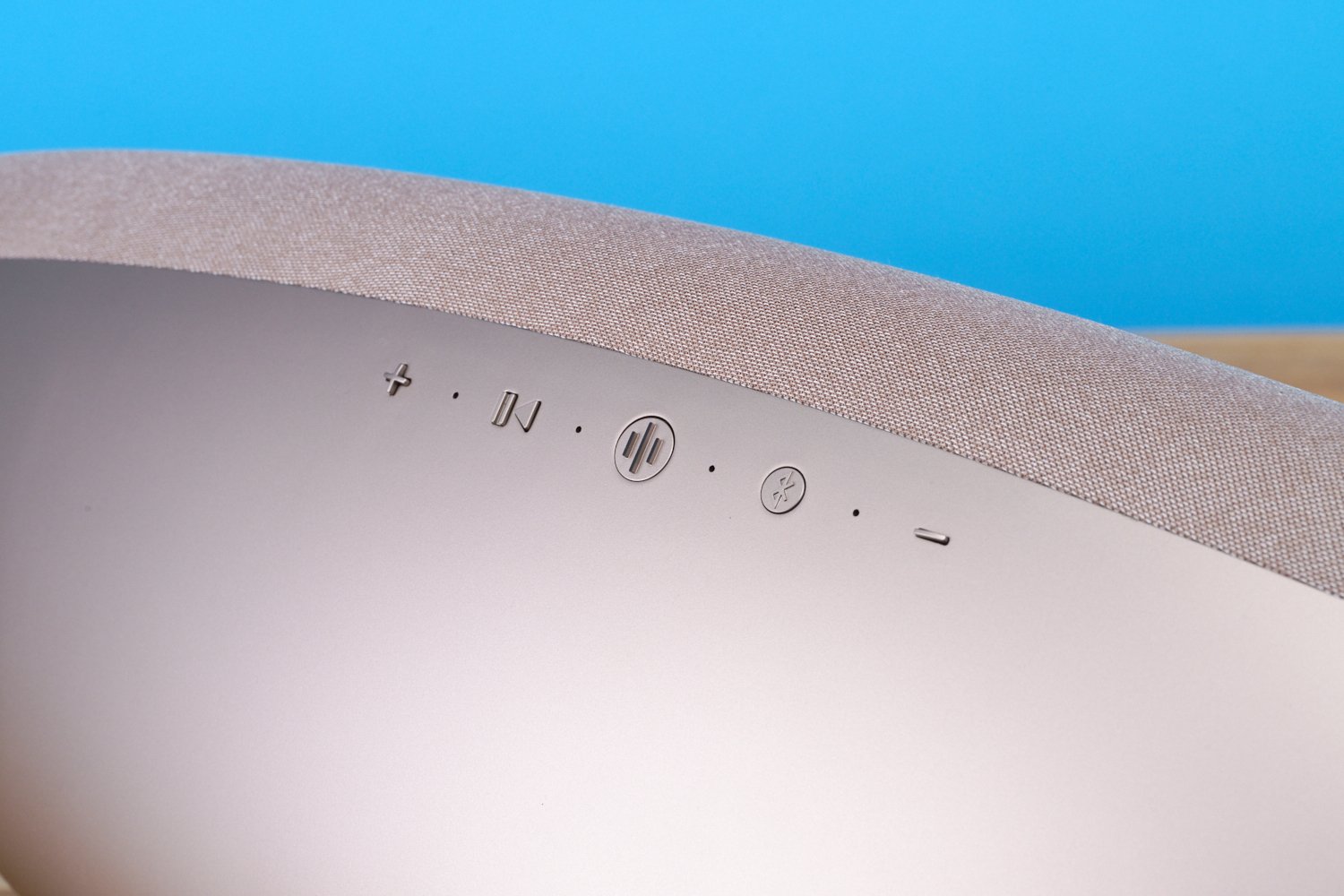 Eine ausführliche Bedienungsanleitung liegt nicht bei und muss heruntergeladen werden. Immerhin ist die Steuerung größtenteils intuitiv: Zwei Lautstärketasten sitzen neben einer Play/Pause-Taste. Mehrere schnelle Klicks auf Play/Pause springen in deiner Playlist vor oder zurück. Die Multifunktions-Taste in der Mitte dient dazu, mehrere Lautsprecher zu gruppieren oder zwischen den verbundenen Quellen hin- und herzuwechseln. Darüber hinaus haben wir sie noch zur Einrichtung benötigt. Die kannst du übrigens nur durchführen, wenn du ein Nutzerkonto bei Bowers & Wilkins erstellst. Das lösen andere Hersteller eleganter.