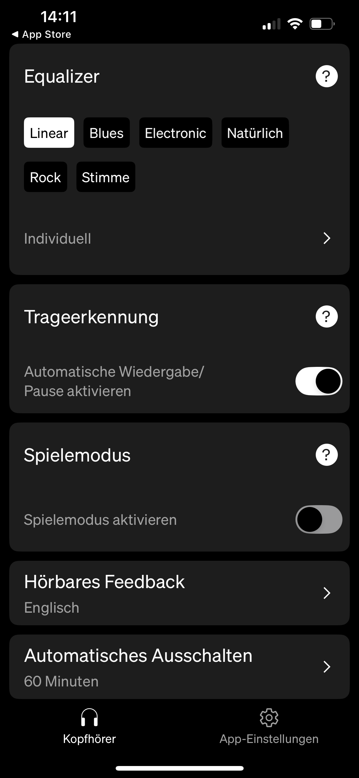 Für noch mehr Steuerungsmöglichkeiten kannst du die „Melomania Connect“-App herunterladen. Sie gibt es für iOS und Android. Viele Funktionen verbirgt sie nicht, dafür aber die wichtigsten. Sie zeigt den Akkustand an, lässt dich den Klang über einen Equalizer ausführlich anpassen und bietet mit dem Spielemodus noch ein nettes Extra. Er reduziert die Latenz der Bluetooth-Übertragung, um Video und Ton möglichst genau zu synchronisieren.