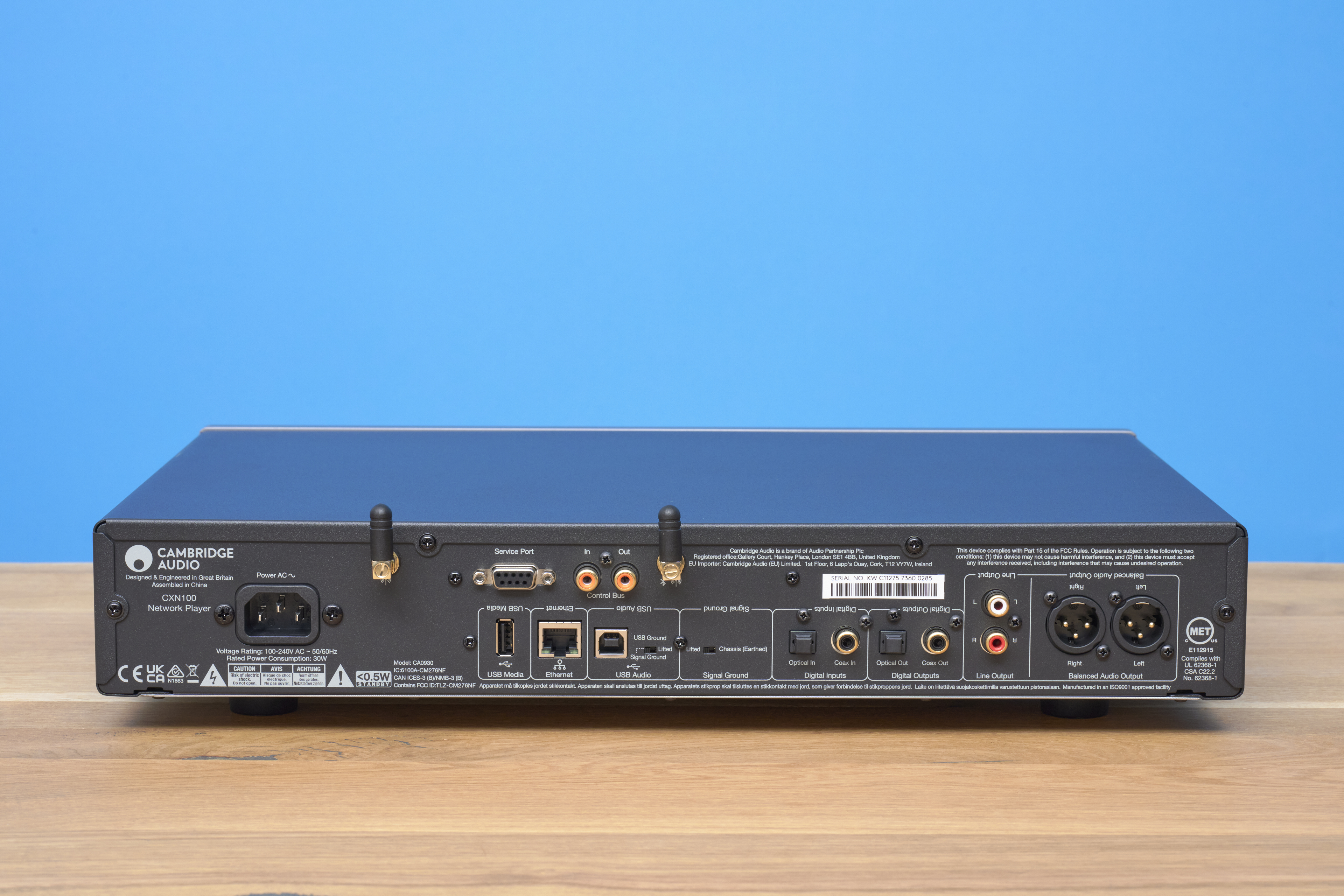 Die Rückwand des CXN100 entspricht weitestgehend der des V2. Und das ist gut so, denn diesem Spieler fehlte es an fast nichts. So finden sich auch am Neuen digitale Ein- und Ausgänge in Koax- wie in optischer Ausführung, durch die der CXN100 auch zum DAC für externe Tonquellen werden kann. Das könnte zum Beispiel ein CD-Laufwerk sein, das Cambridge designmäßig passend im Programm hat.