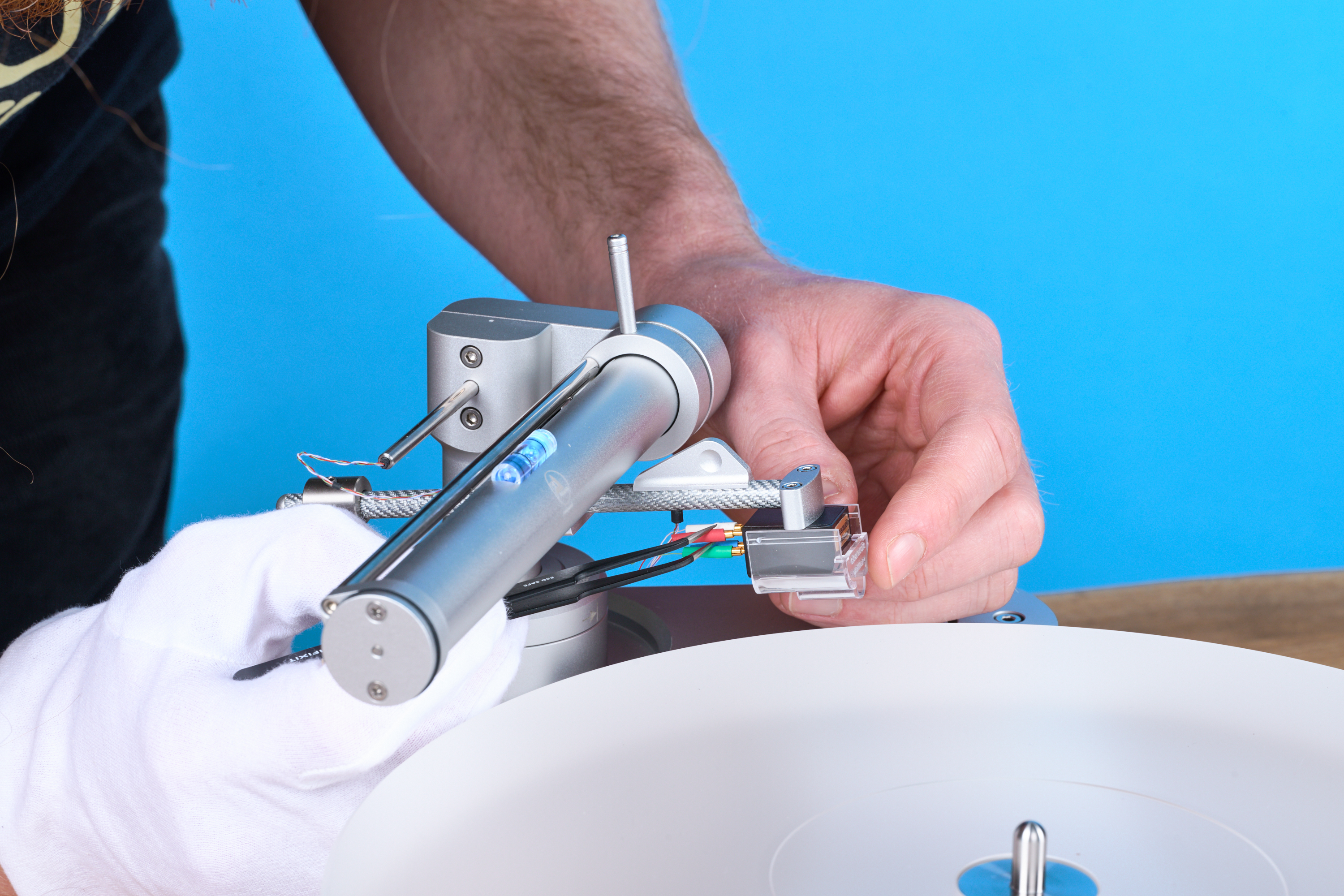 Eine Skalierung existiert nicht, du brauchst also eine Tonarmwaage. Für den Notfall liegt dem Arm eine kleine Aluwippe bei, die diese Funktion allerdings nur recht ungenau erfüllt. Selbst mit unserer eigenen Präzisionswaage erwies sich die Gewichtseinstellung als fummelig, weil man an die Arretierungsschraube des Gegengewichts (ein 1,5er Inbus) von hinten und unten heranmuss. Das ist allerdings Gewöhnungssache. Wenn man’s ein paarmal gemacht hat, gehen alle Einstellungen sauber und reproduzierbar von der Hand.
