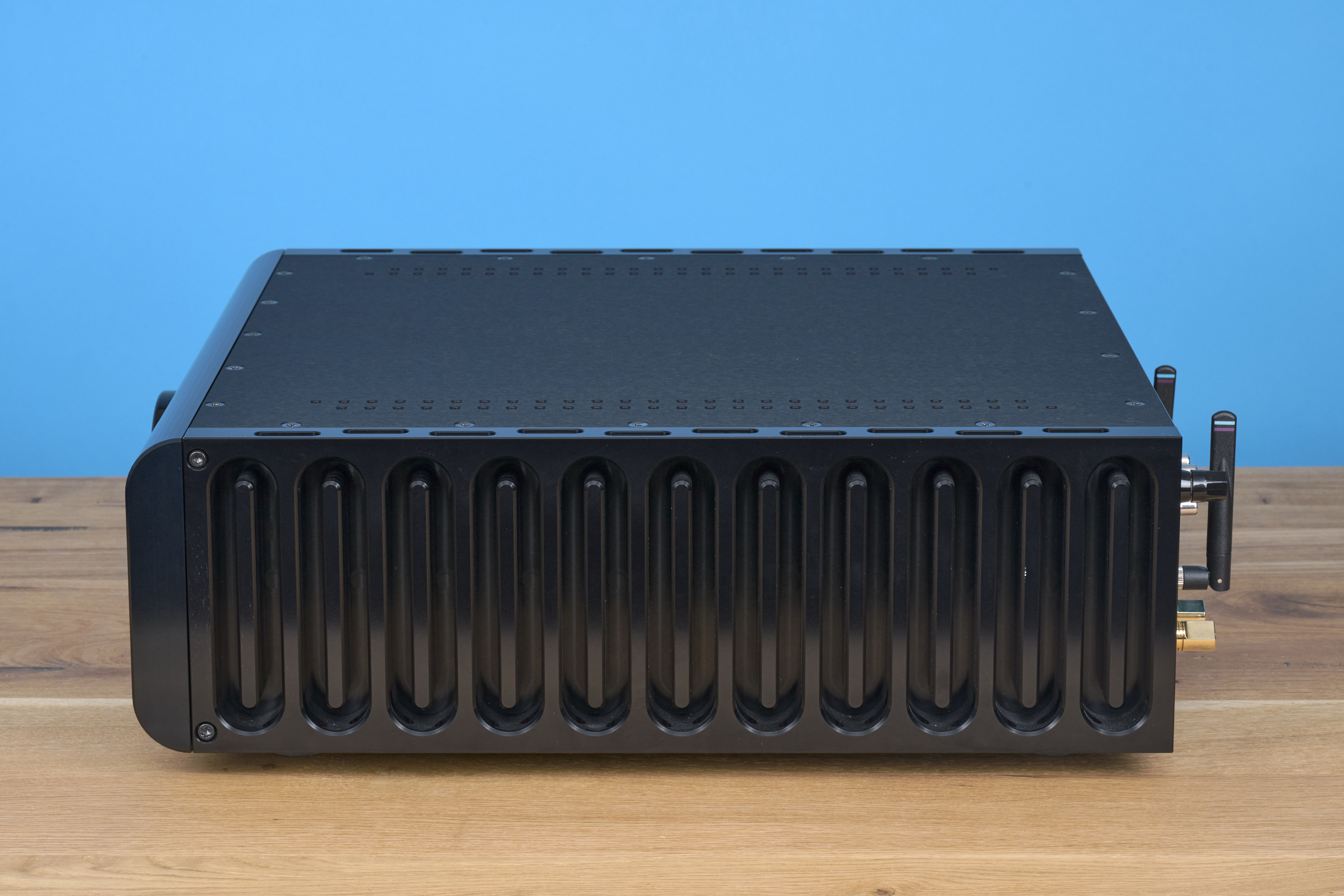 Auf den Versuch haben wir es natürlich nicht ankommen lassen, aber robust genug wirkt der Progression Integrated allemal, auch wenn sein Gehäuse nicht aus einem großen Block Aluminium gefräst ist. Diese Art der Herstellung hebt sich D’Agostino für die anderen Produktserien auf, bei denen dann auch die seitlichen Kühlrippen aus Kupfer bestehen. In der Progression-Serie setzt man auf das weniger empfindliche Aluminium. Wo andere Hersteller jedoch auf dünne Rippchen setzen, fräst bei D’Agostino eine CNC-Maschine ein Schlangenmuster in die Seitenteile.