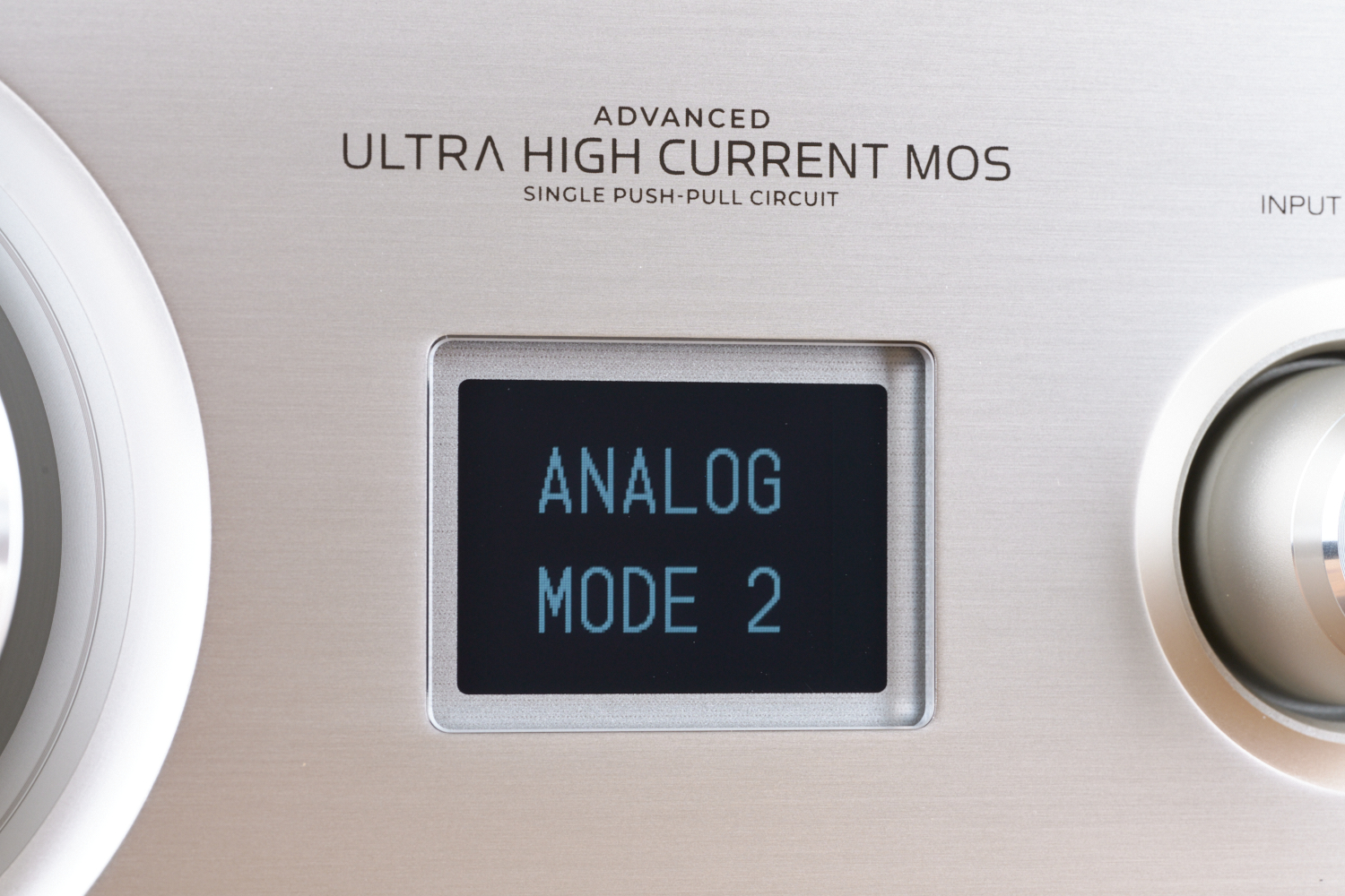 Im bestklingenden „Analog Mode 2“ bleibt das OLED-Fenster komplett dunkel. Intern wird der zugehörige Prozessor vom Strom getrennt, ebenso sämtliche digitalen Baugruppen. Der Amp mutiert damit zu einem klassisch-analogen Verstärker mit Phono-Eingang und drei weiteren Line-Eingängen. Seine Intelligenz reicht gerade noch aus, um der IR-Fernbedienung zu gehorchen.