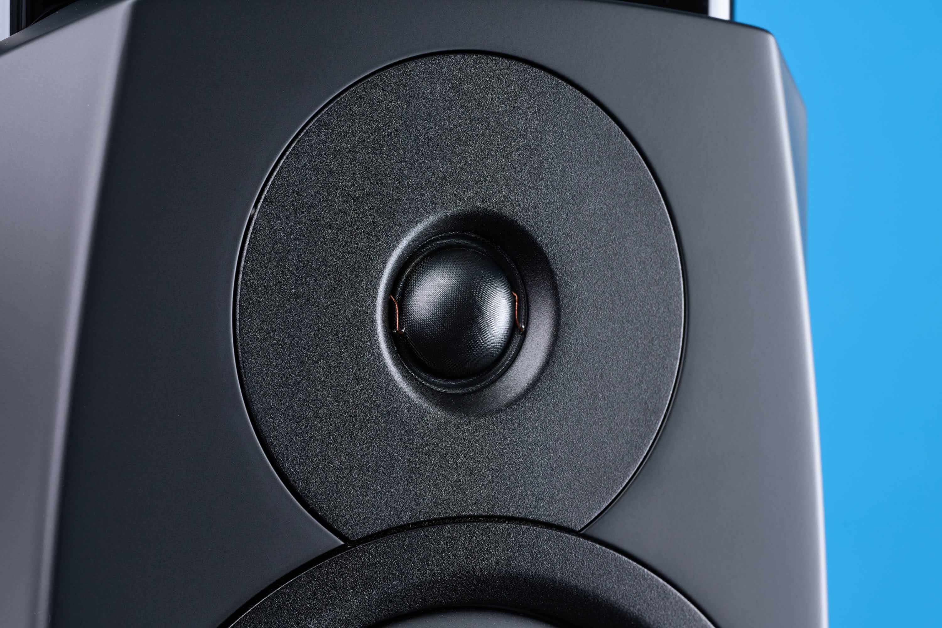 Beim Hochtöner vertraut Dynaudio auf eine recht große Gewebekalotte, die für ein besseres Abstrahlverhalten lackiert wird. Dieses Prinzip kennen wir bereits von der Evoke 50. Wie bei dieser sitzt hinter der eigentlichen Gewebekuppel eine Zweite aus einem starren Kunststoffgitter. Hexis nennt Dynaudio diesen Aufbau, der die Belüftung des Hochtöners verbessern und so unliebsame Schallanteile weiter minimieren soll. Zusammen mit einem stärkeren Neodym-Magneten entsteht so der Esotar-3-Hochtöner.