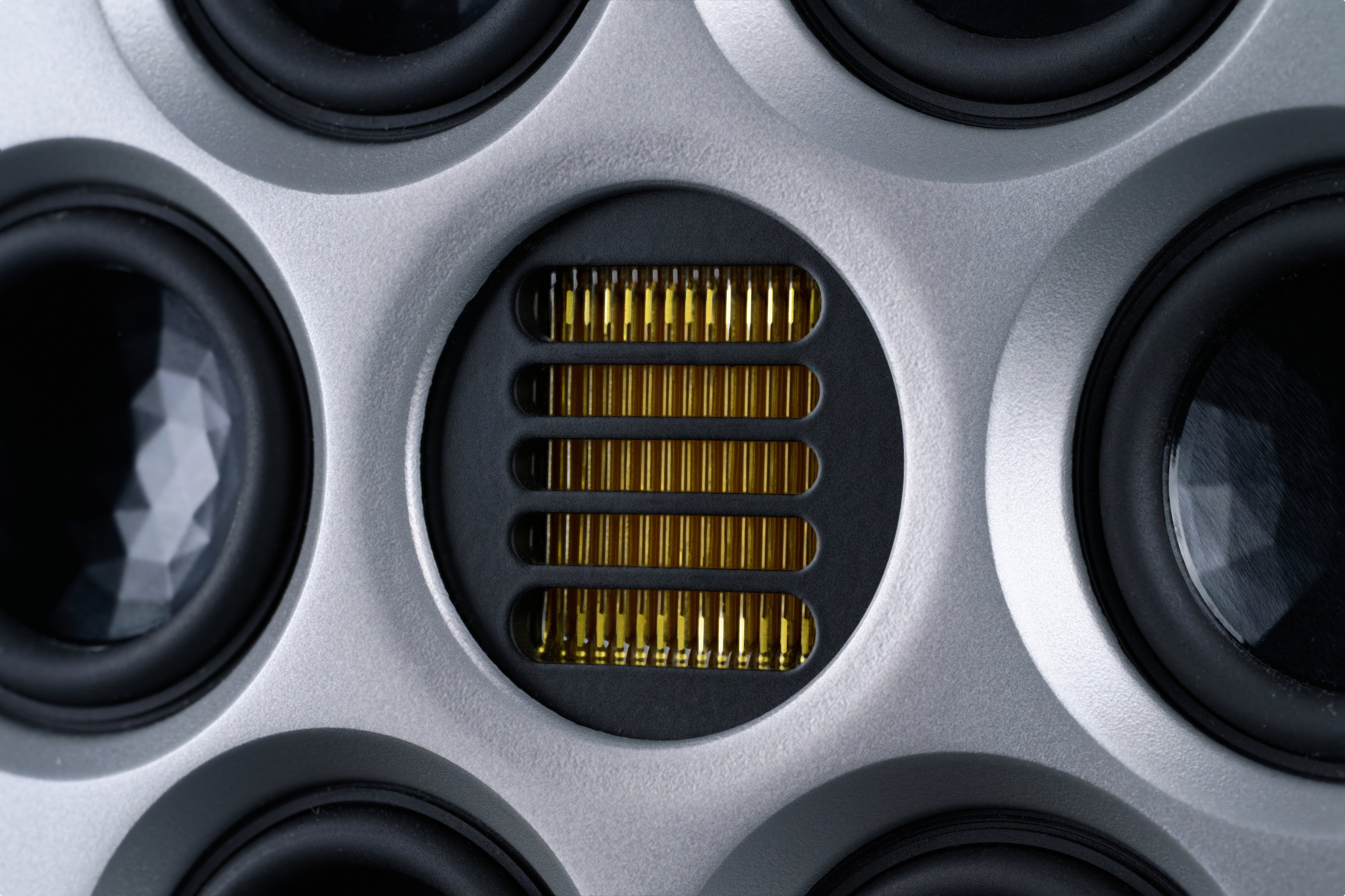 Das mit dem Rad ist aber nur eine 90-Grad-Drehung um den Lautsprecher entfernt, denn an der Front sitzt jene runde Treibereinheit, die Elac tatsächlich vollkommen neu entwickelt hat. Sechs niedliche Mitteltöner umringen eine kleine Sonderform des aktuellen JET-6-Hochtöners. VXe-System (Variable Coaxial Electric) nennt Elac diesen Aufbau. Auf den ersten Blick erinnert er uns an die Monitor Audio Hyphn, doch liegt die eigentliche Stärke der Elac Concentro M 807 auf ihrer Rückseite: Über einen Drehknopf kannst du entweder die linke oder die rechte Hälfte der Mitteltöner in ihrer Lautstärke absenken. Was das genau bewirkt, schauen wir uns im Praxisteil dieses Tests genau an.