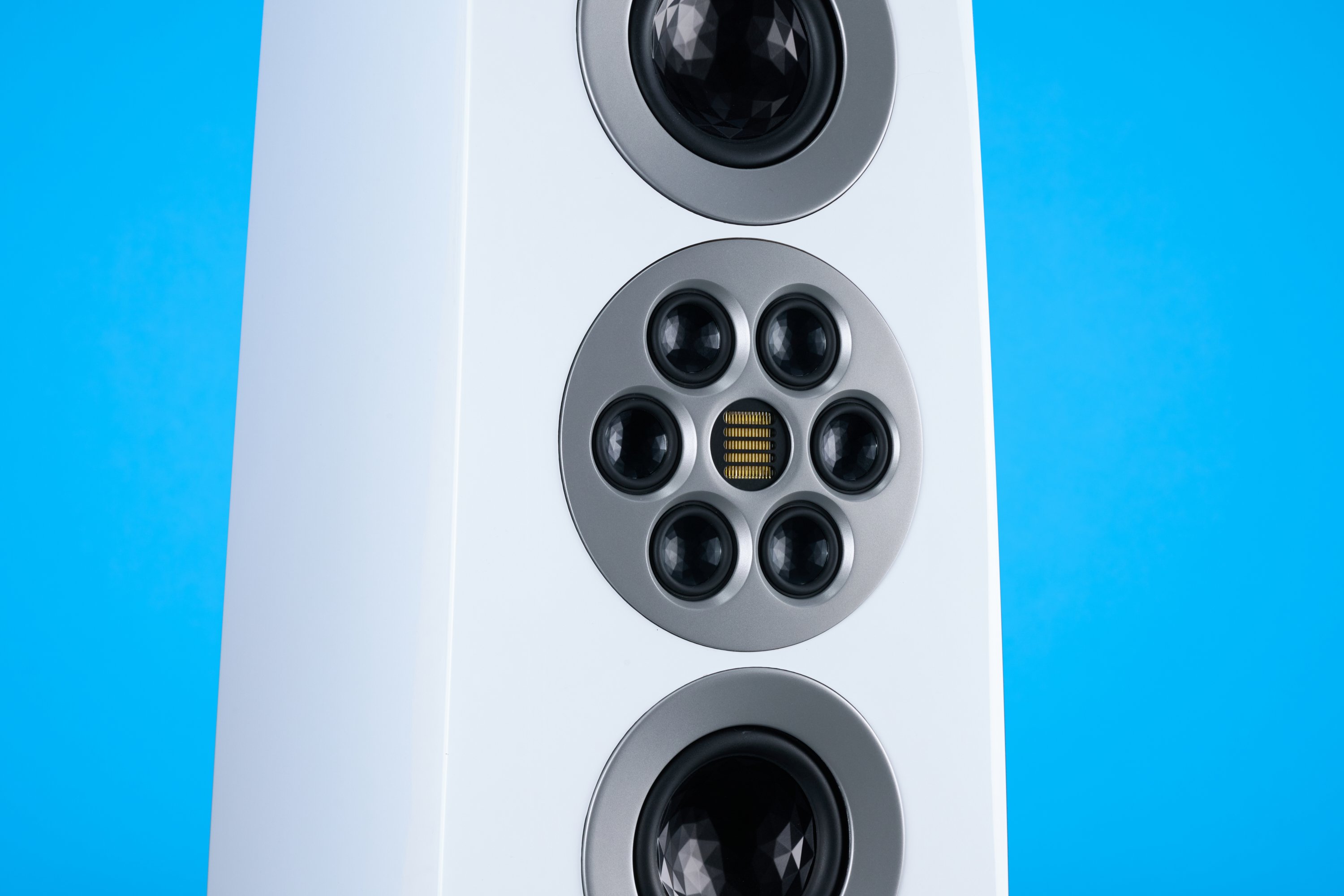 Die Frequenzlücke zwischen den seitlichen Tieftönern und dem VXe-System füllen zwei weitere, mit 115 Millimetern deutlich größere, Mitteltöner. Wie jene ihrer kleineren Kollegen haben ihre Membranen eine kristallähnliche Struktur, die ihnen zusätzliche Stabilität verleiht. Kurz gesagt ist die Elac Concentro M 807 also ein Vier-Wege-Standlautsprecher mit elf Treibern und nach unten abstrahlendem Bassreflexloch. Noch Fragen?