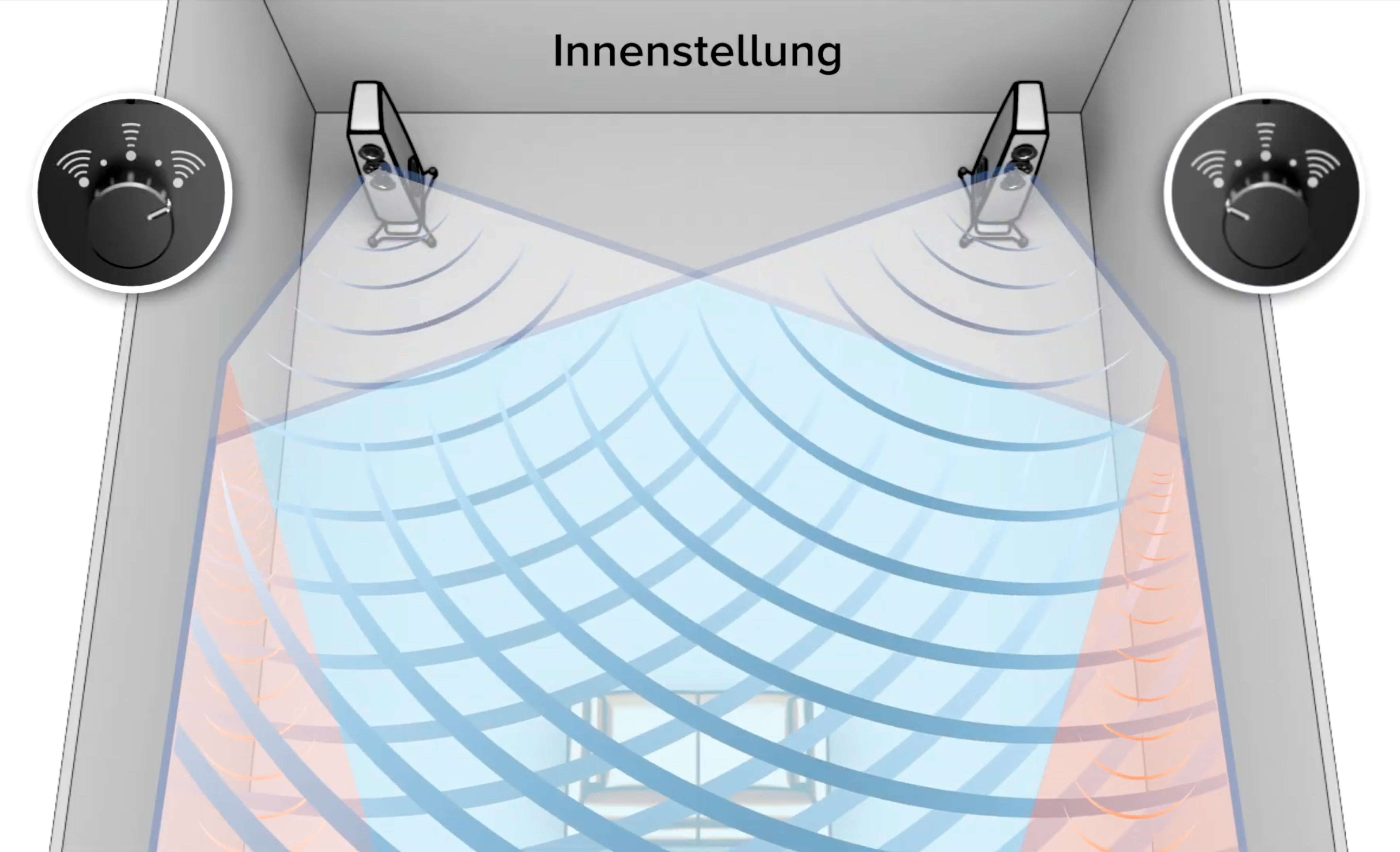 Durch den Drehknopf kannst du zur einen Seite des Lautsprechers – also zur Stereomitte hin, oder nach außen – mehr Schallenergie schicken. Stell dir vor, rechts von deinem Hörplatz ist eine Wand, nach links öffnet sich dein Wohnzimmer aber in das offene Esszimmer. Normalerweise würde dich zwar immer noch genauso viel Direktschall von beiden Lautsprechern erreichen, doch der von den Wänden reflektierte Schallanteil wäre von links viel geringer als von rechts. Und dieser Diffusschall trägt entscheidend dazu bei, wie du deine Musik wahrnimmst. Diese Diskrepanz im Diffusschall kannst du jetzt dadurch anpassen, dass du den linken Lautsprecher mehr Schallenergie nach außen schießen lässt.