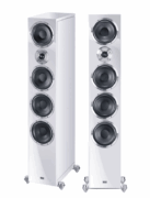 Noch markanter sind jedoch die fünf Treiber. Diese bilden mit ihren schwarzen Membranen einen krassen Kontrast zum weißen Gehäuse. Den Übergang bilden die silbrig glänzenden Metallkörbe, die die Treiber im Gehäuse halten. Dafür setzt Heco auf Inbus-Schrauben, die sichtbar aus den Metallringen und dem Wave Guide des Hochtöners hervorlugen. Insgesamt verfolgt Heco mit der In Vita 9 ein eher industrielles Design, das jedoch nie klobig wirkt. Auf Wunsch verschwindet die komplette Front der Lautsprecher hinter den magnetisch haltenden Stoffbespannungen.