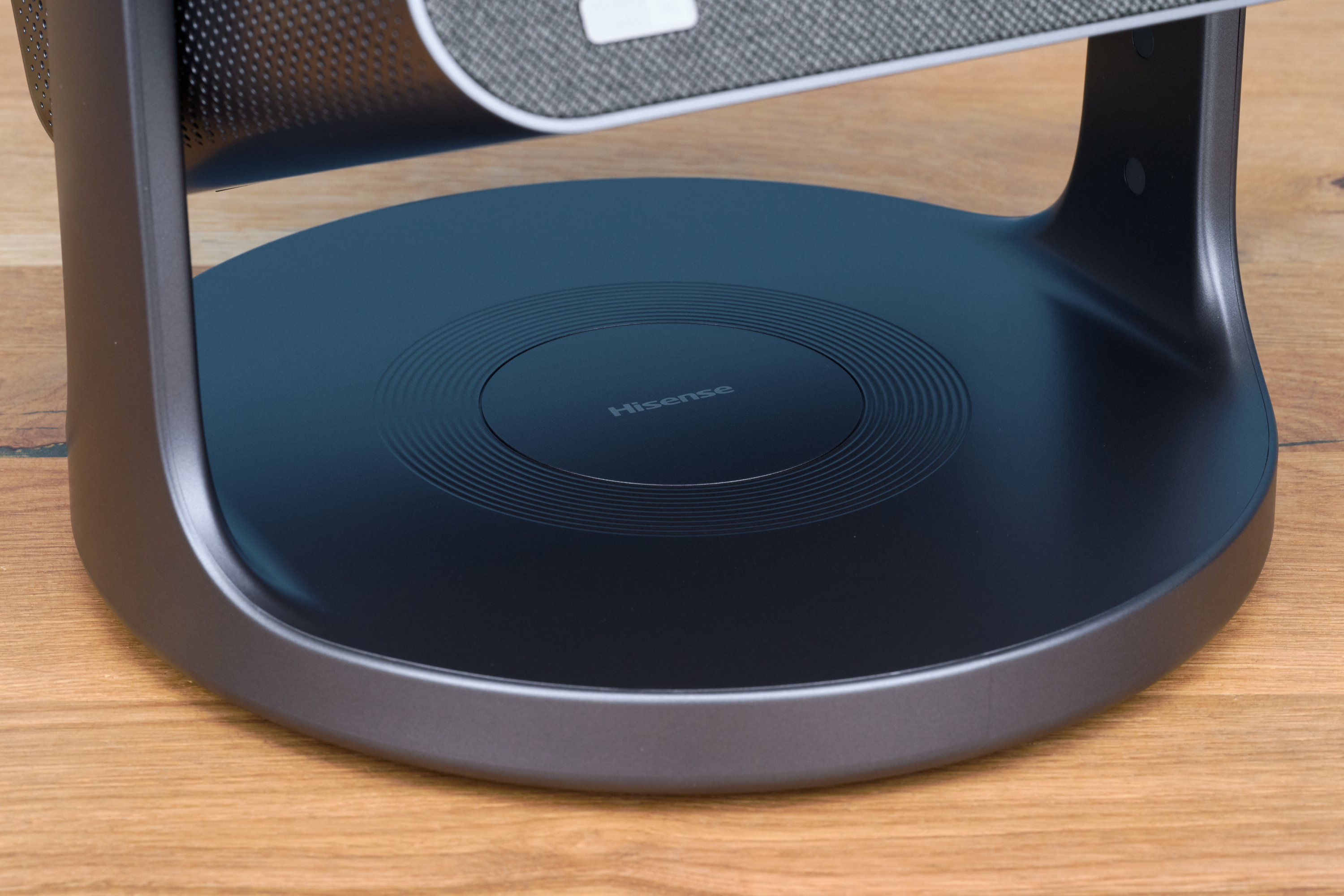 Beim Design geht Hisense mit der neuen C2-Reihe neue Wege. Zwar bleibt die würfelartige Form des Vorgängers Hisense C1 in groben Zügen erhalten, doch der C2 macht fast alles neu. Der eigentliche Beamer schwebt dank zwei seitlichen Armen über dem runden Standfuß. Dieses Schwenkdesign sieht etwas futuristisch aus, ist aber vor allem praktisch.