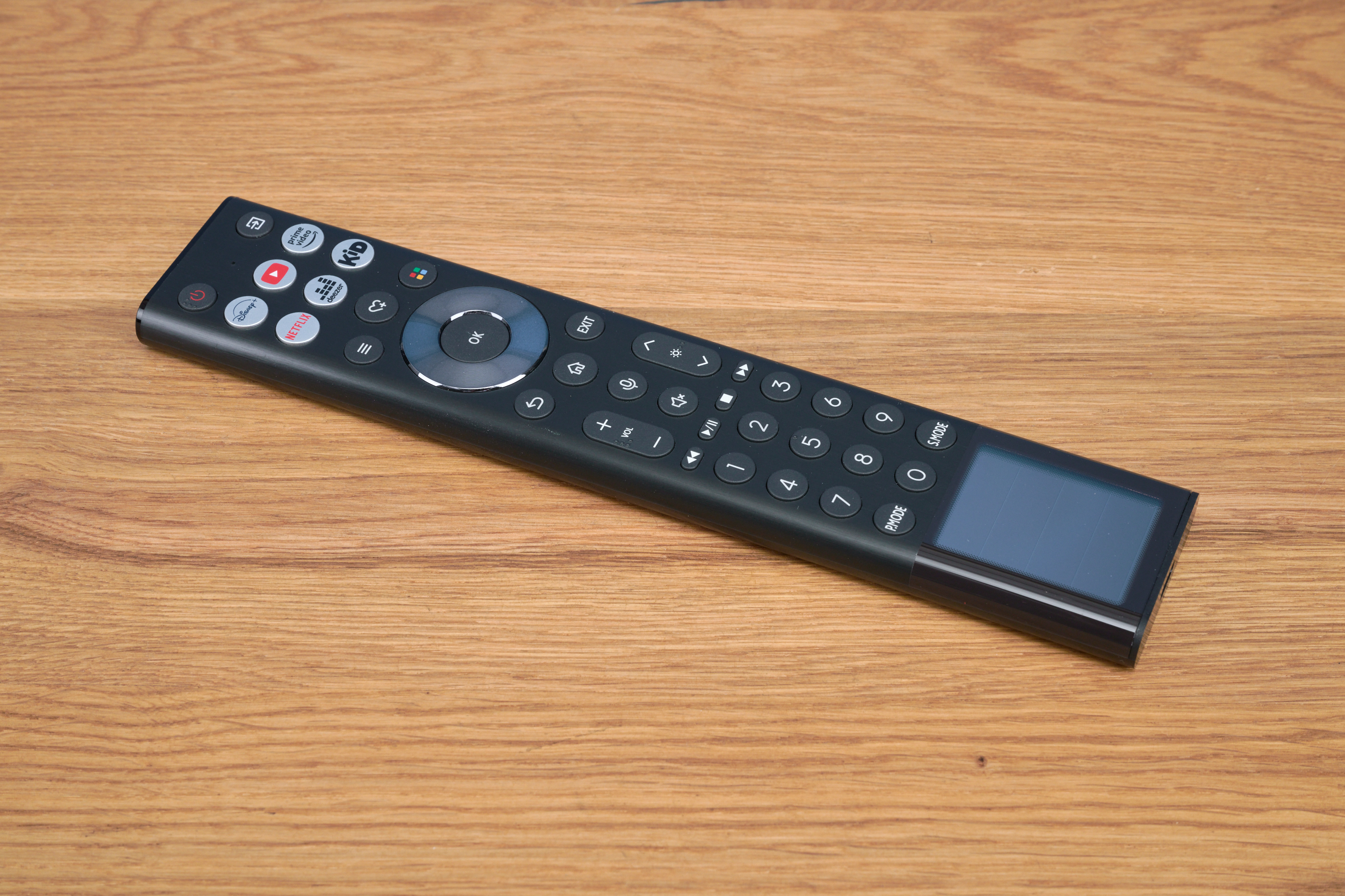 Lob gibt es von uns auch für die Fernbedienung: Sie liegt gut in der Hand, ist nicht überladen und hat ein nettes Extra. Ein kleines Solarpanel sorgt dafür, dass du dich um den Batteriewechsel nicht mehr kümmern musst – anders als bei der Konkurrenz, etwa beim Xgimi Aura 2.