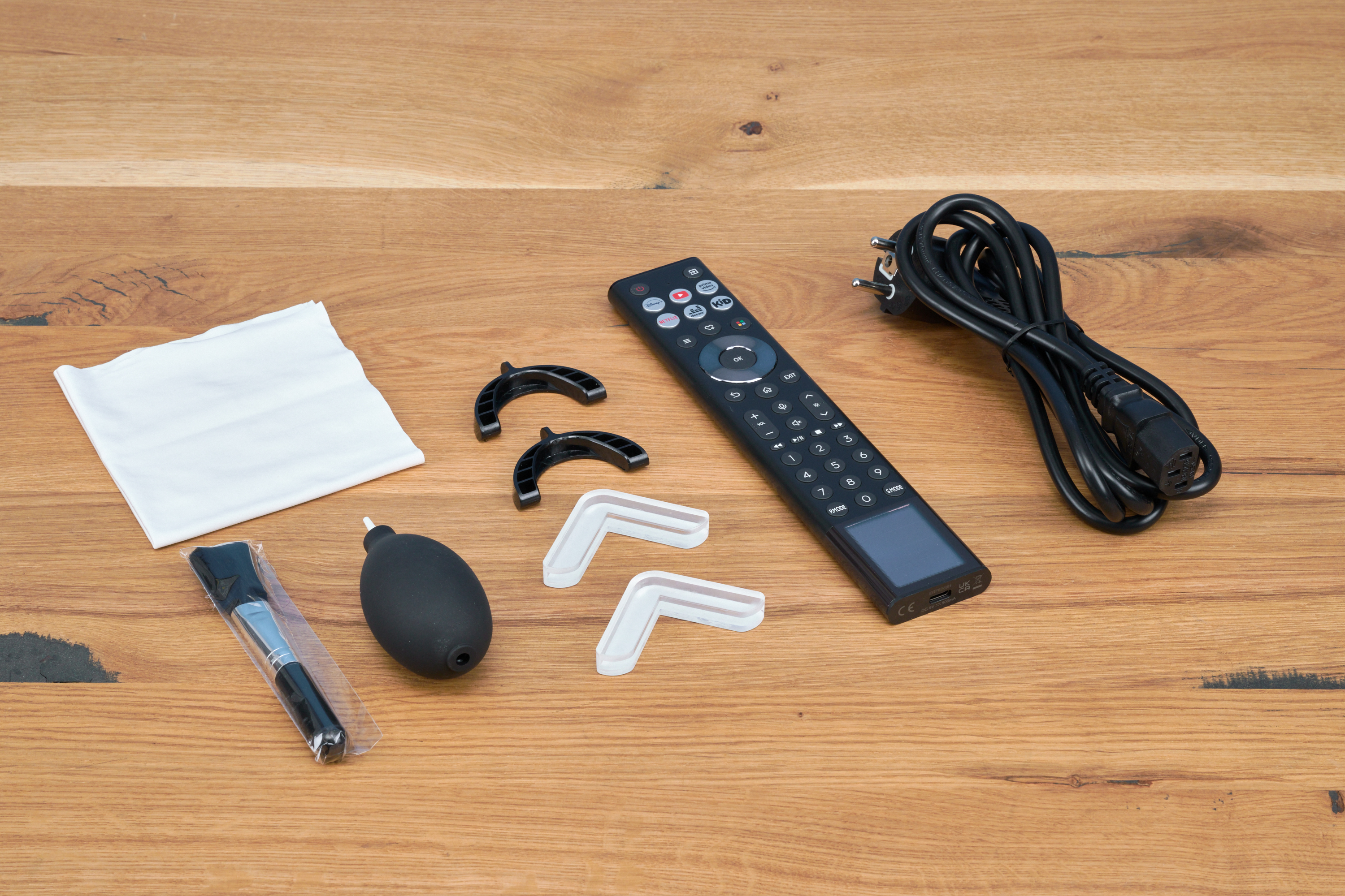 Beim Auspacken mussten wir doch etwas staunen: Weiße Handschuhe, ein kleiner Blasebalg und ein Staubpinsel werden mitgeliefert, damit der Projektor möglichst ohne Kratzer aufgestellt und künftig von Staub befreit werden kann. Ob das wirklich notwendig wäre, sei mal dahingestellt, aber so kommt direkt ein wenig Luxus-Feeling auf.