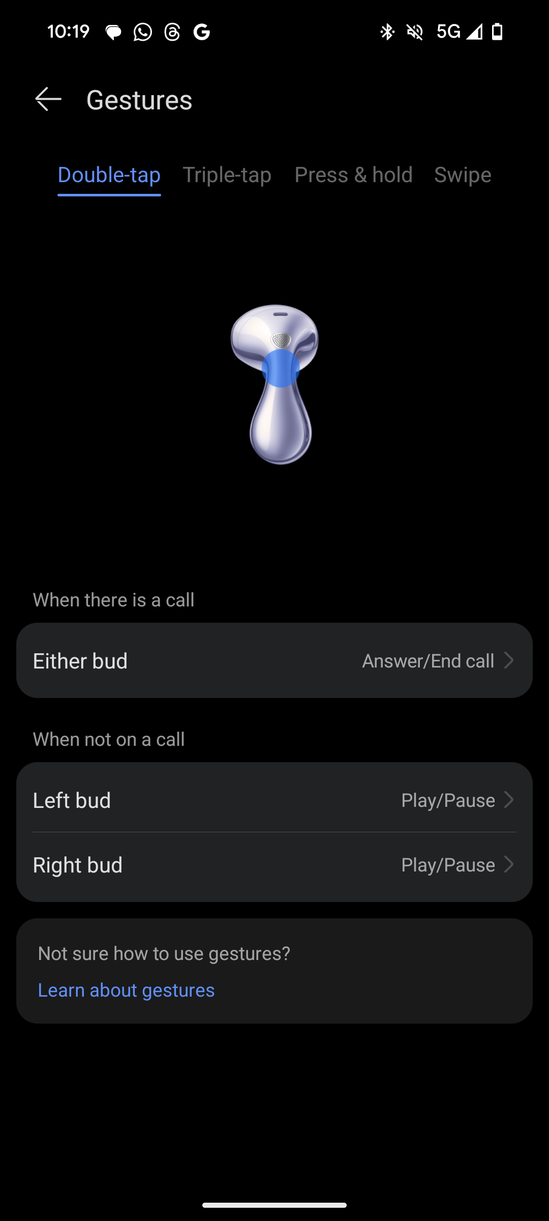 Neben der Bedienung via Kopfgesten steht noch die gewohnte Bedienung über Touch-Gesten zur Verfügung. Und die lässt sich über die App ausführlich anpassen. Beide Earbuds lassen sich autonom voneinander belegen und sogar die Lautstärkeregelung ist über Wisch-Gesten möglich.