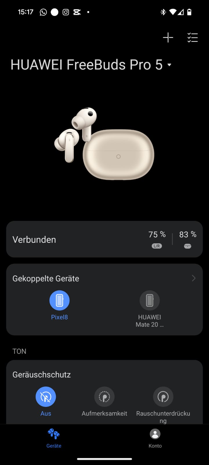 Bei der Akkuleistung geht Huawei kleine, aber stetige Schritte. Die FreeBuds Pro 3 hielten vier Stunden, die Pro 4 fünf Stunden und die Pro 5 nun sechs Stunden am Stück bei aktivierter Geräuschunterdrückung. Mit dem Case wächst die Akkulaufzeit auf bis zu 25 Stunden an. Das ist weiterhin nicht Bestleistung, die WF-1000XM6 etwa liefern acht Stunden, die Technics EAH-AZ100 sogar zehn, obere Mittelklasse und für den Alltag ausreichend ist es trotzdem.