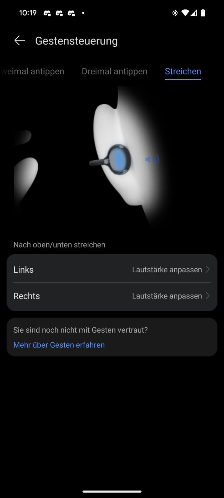 Spannender wird es bei der Bedienung der Huawei FreeClip 2. Hier hat Huawei einige Optionen hinzugefügt und ermöglicht jetzt die Bedienung via Wisch- und Kopfgesten. Erstere sind zur Regelung der Lautstärke und funktionieren im Test solide. Gut gefällt, dass in der App direkt visualisiert wird, wie du die FreeClip 2 bei der Bedienung bestenfalls halten solltest. So müssen wir nicht erst an den Buds herumprobieren.