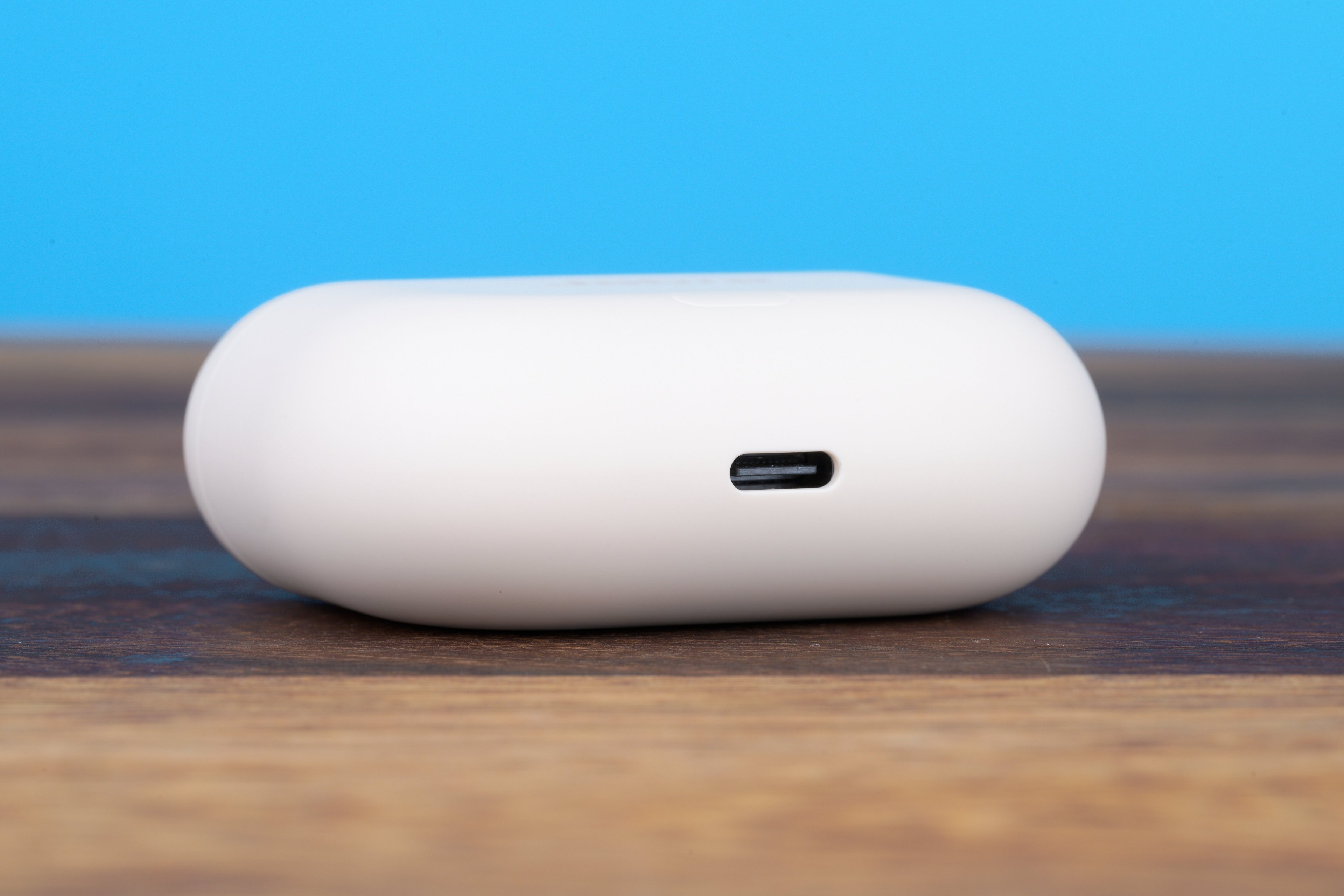 Veränderungen gibt es dafür beim Ladecase. Dieses ist etwas schwerer als beim Vorgänger, fungiert dafür aber ja auch als Bluetooth-Sender. Ein zusätzlicher Knopf an der Frontseite koppelt die entnommenen Earbuds mit dem Case, wenn dieses per 3,5-Millimeter-Klinke oder USB-C mit einem Endgerät verbunden ist. Dementsprechend ist im Lieferumgang auch ein 3,5-Millimeter-Klinken-Adapter für das beigelegte USB-C-Kabel enthalten.