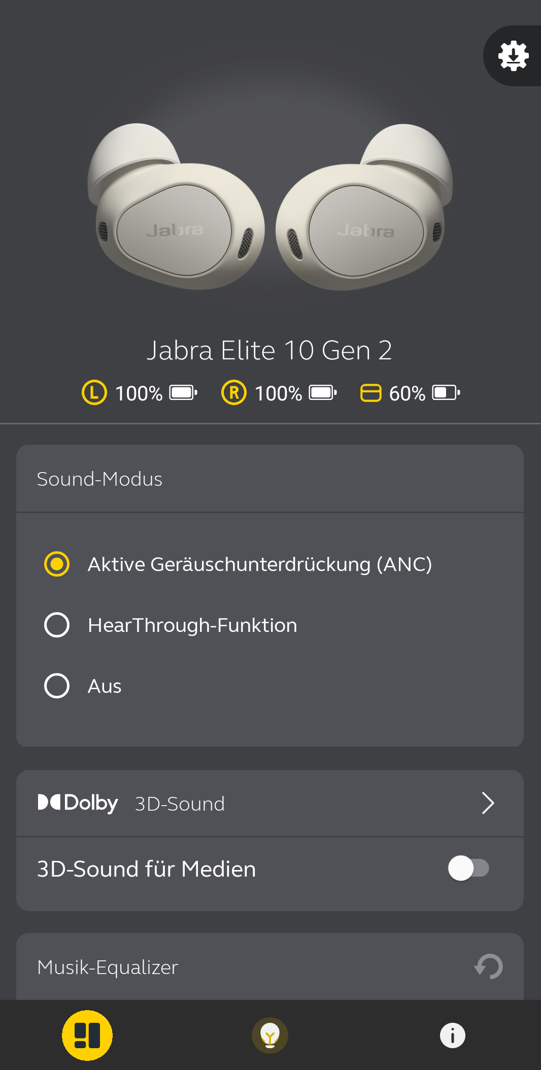 In puncto App bieten die Elite 10 Gen 2 dasselbe Paket, wie die Jabra Elite 10. Ein manueller 5-Band-Equalizer wird in der Sound+-App durch diverse Presets ergänzt. Außerdem kannst du eigene Presets benennen und anlegen. Hier ergibt es durchaus Sinn, ein wenig Zeit zu investieren, um für unterschiedliche Genres angenehme Sound-Profile parat zu haben. Presets wie „Verstärkte Bässe“ und „Sanft“ erledigen ihren Job aber auch schon mehr als passabel und machen den Sound noch gefälliger.