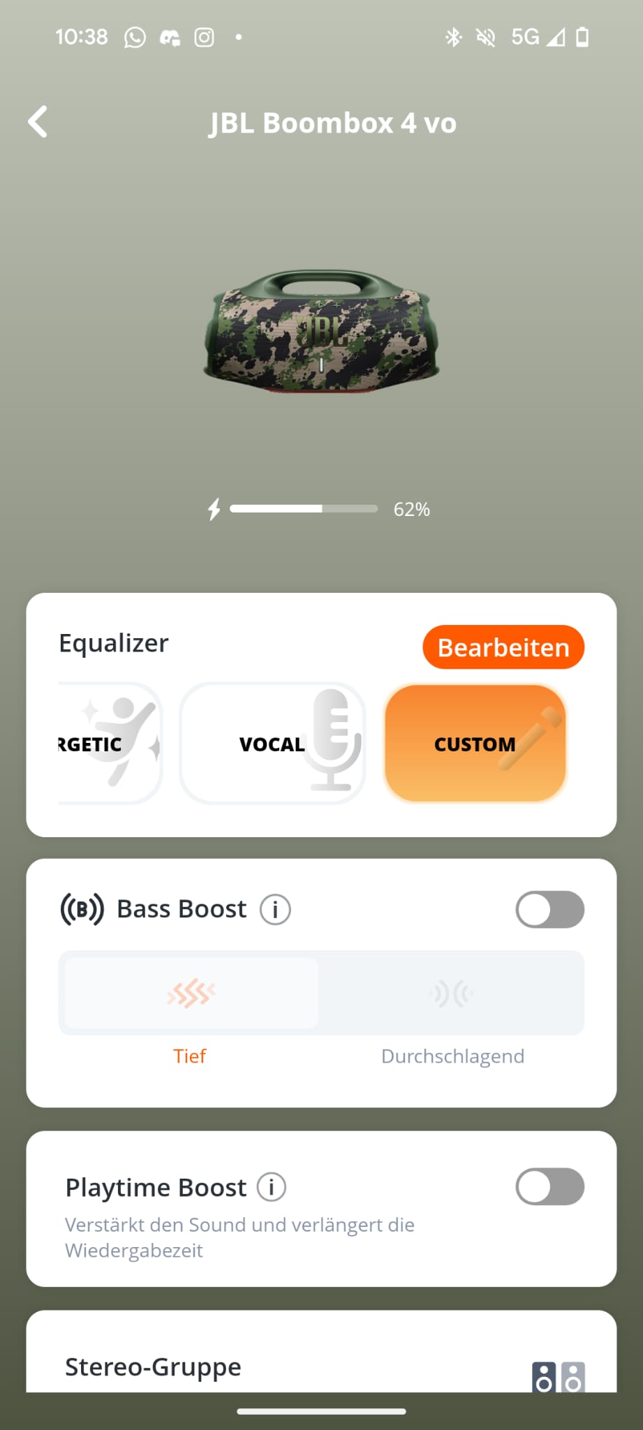 Der Unterschied ist kaum hörbar, relativiert sich bei gleichzeitiger Bedienung des manuellen Equalizers ziemlich schnell und kann bei der Wiedergabe von Pop- oder Hip-Hop-Musik auch in die andere Richtung ausschlagen. DENIAL IS A RIVER von Doechii oder Doja Cats Jealous Type klingen mit der Boombox 4 noch breiter und weniger gedrungen und profitieren noch dazu von JBLs zwei Bass-Boost-Modi.