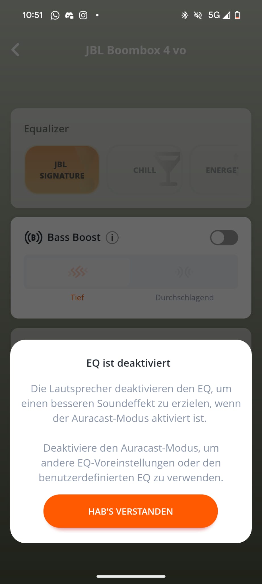 In unserem Testlabor probieren wir das Ganze mit JBL Flip 7, Charge 6 und Boombox 4 aus und lassen letztere den Ton angeben. Das funktioniert problemlos und ohne Latenz zwischen den jeweiligen Lautsprechern. Beachte aber, dass dir während einer Auracast-Wiedergabe der Zugriff auf den manuellen Equalizer verwehrt bleibt.