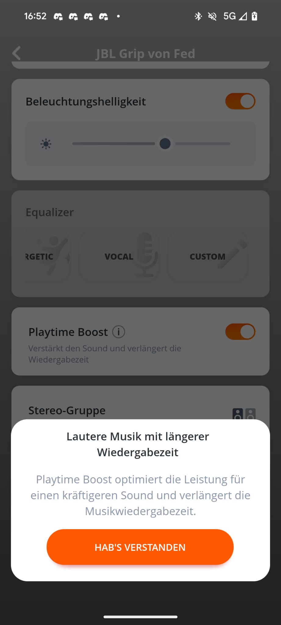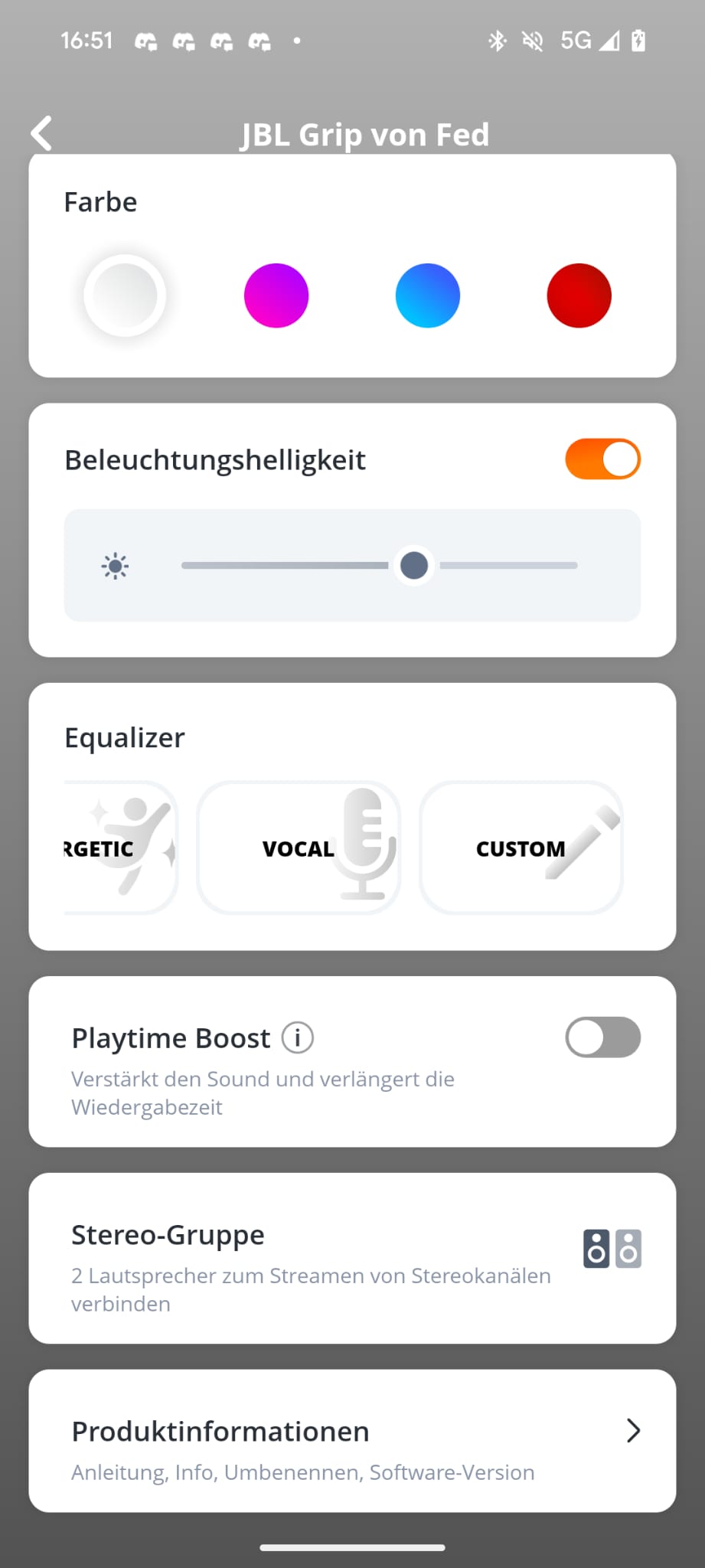Zuerst klicken wir uns aber weiter durch das Hauptmenü der App und begegnen direkt einem Lichtregler, den wir so von Charge 6 und Flip 7 nicht kennen. Damit bestimmst du, ob und wie dein Grip leuchten soll. Von Wabern über Blinken bis hin zu beständigem Leuchten in unterschiedlichen Farben ist alles möglich. Das macht in einem dunklen Raum wirklich was her und ist ein nettes Add-on, das dem Grip etwas Partybox-Charakter verleiht. An den JBL Pulse 5 mit seinem Ganzkörper-Lavalampen-Look kommt der kleine Strahlemann aber natürlich nicht ganz heran.