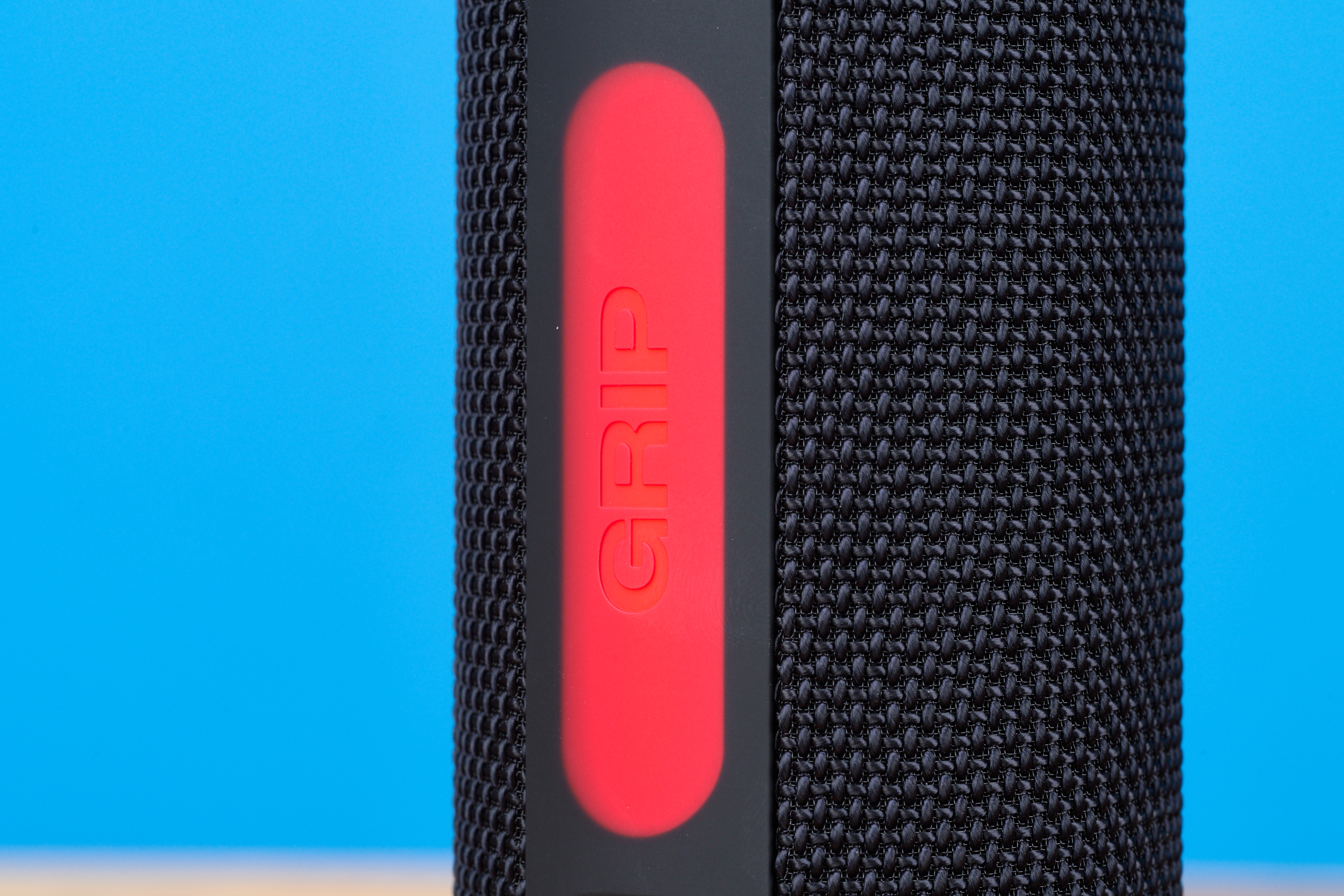 Auf den ersten Blick erinnert das Design des JBL Grip stark an seinen großen Bruder, den Flip 7. Der zylinderförmige Lautsprecher liegt ziemlich angenehm in der Hand und kommt vom Formfaktor einer großen Getränkedose nahe. Ein großer Unterschied: Weil der JBL Grip im Gegensatz zu Charge und Flip auf seitliche Bassradiatoren verzichtet, wirst du ihn meist im aufgerichteten Zustand betreiben.