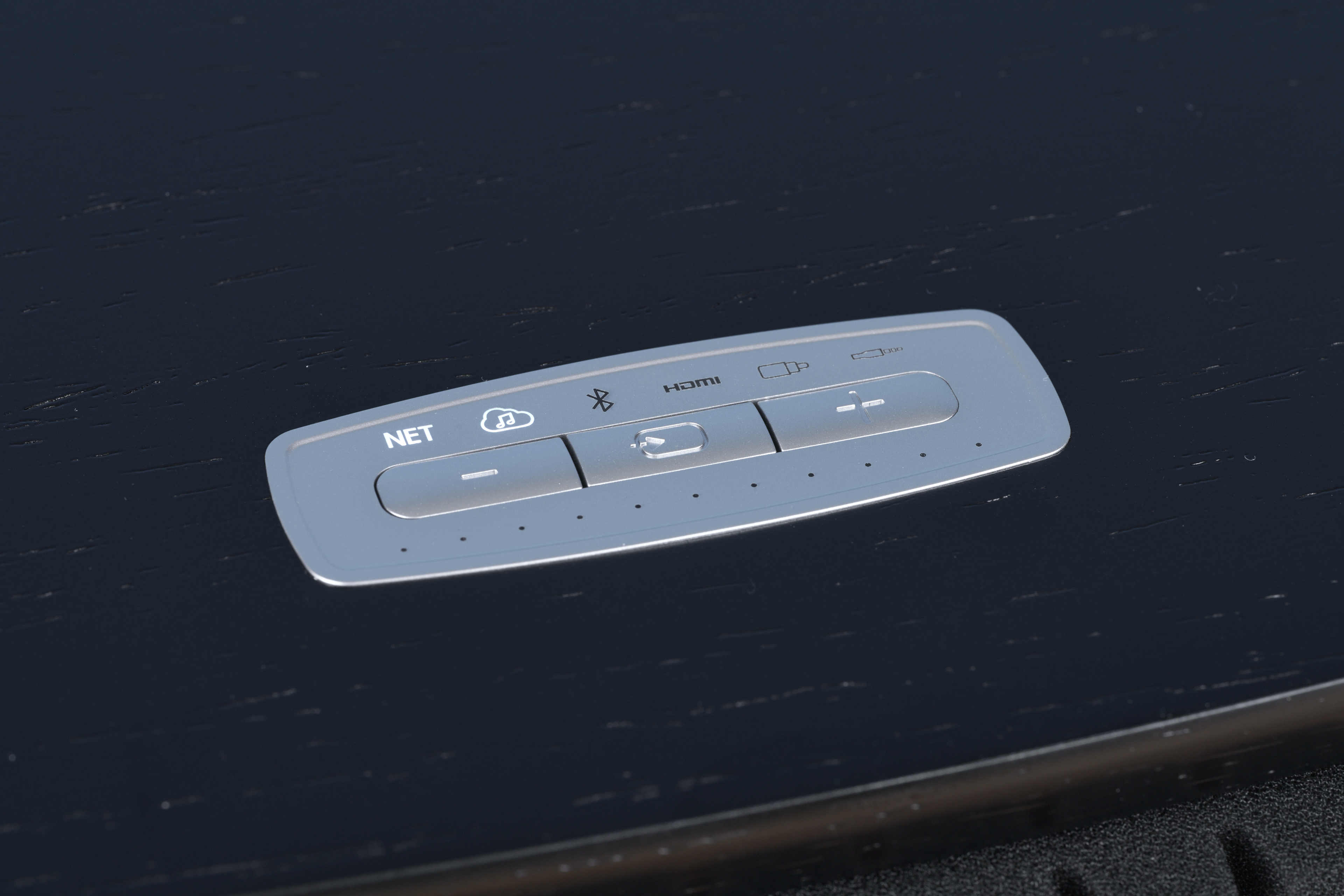Eine weitere Cinchbuchse bildet den bereits beschriebenen Subwoofer-Ausgang, dann folgt LAN und ein USB-A-Serviceport. Bedienen kannst du das L42 in Grundzügen (Eingänge und Lautstärke) direkt am Gerät, sowie deutlich umfangreicher mit der mitgelieferten Fernbedienung. Die fühlt sich in der Hand zwar sehr leicht und billig an, funktioniert aber mit Bluetooth, muss also keinen direkten Blickkontakt zum All-In-One-System haben.
