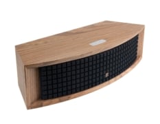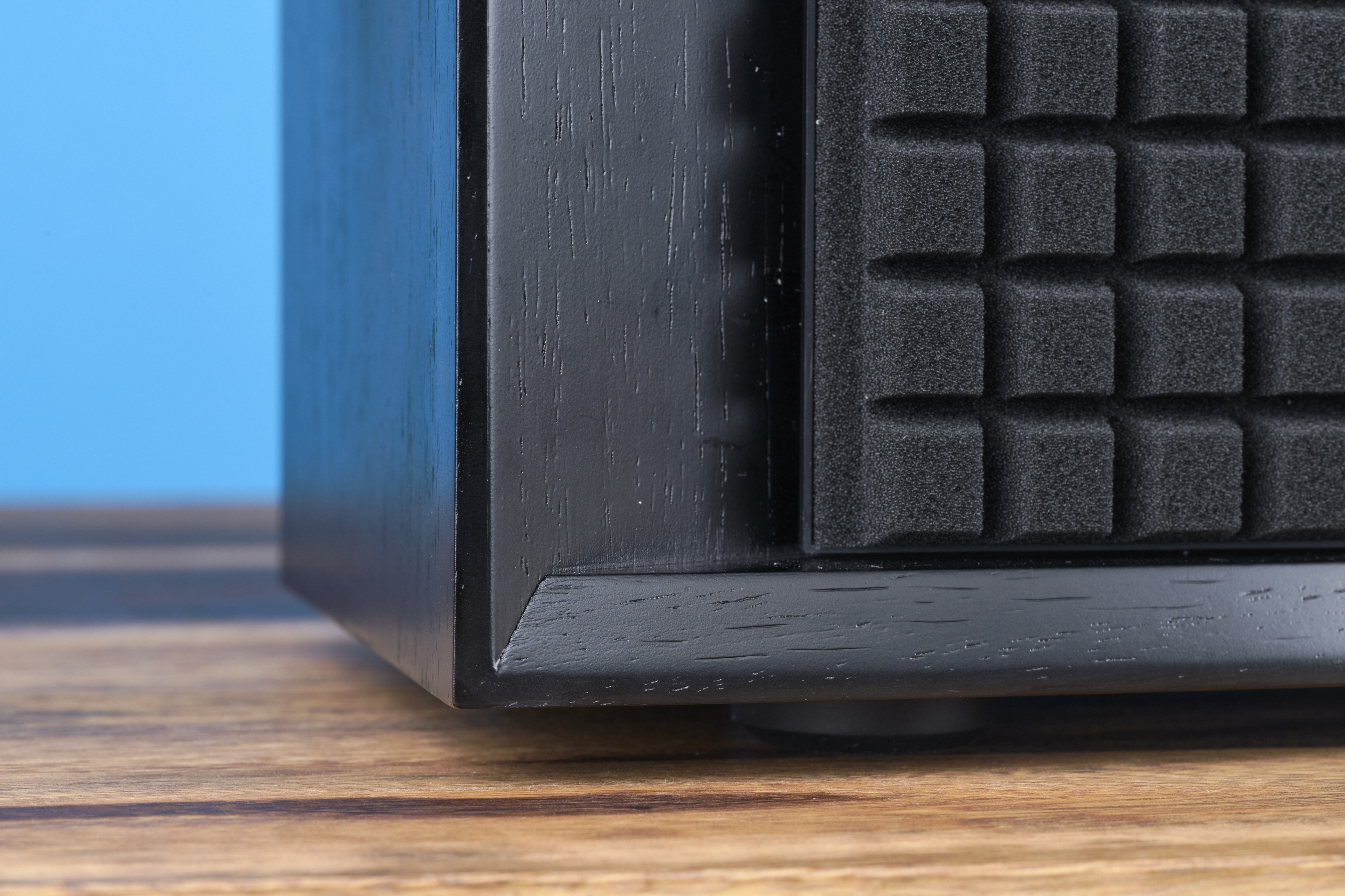 Die Lautsprecher des JBL sitzen hinter einem abnehmbaren, magnetisch gehaltenen Grill aus offenporigem Schaum. „Quadrex“ nennt der Hersteller das Material, das mit seinem Waffelmuster an JBL-Klassiker aus den Seventies erinnert. Der Rest des Gehäuses ist sehr sauber mit schwarzem oder Nussbaum-Echtholzfurnier bedeckt. Das Treiber-Team besteht pro Kanal aus einem 100-Millimeter-Tiefmitteltöner mit weißer Zellulosefaser-Membran (auch das ein Rückgriff auf klassische Materialien) und einer 19-Millimeter-Hochtonkalotte aus Alu.