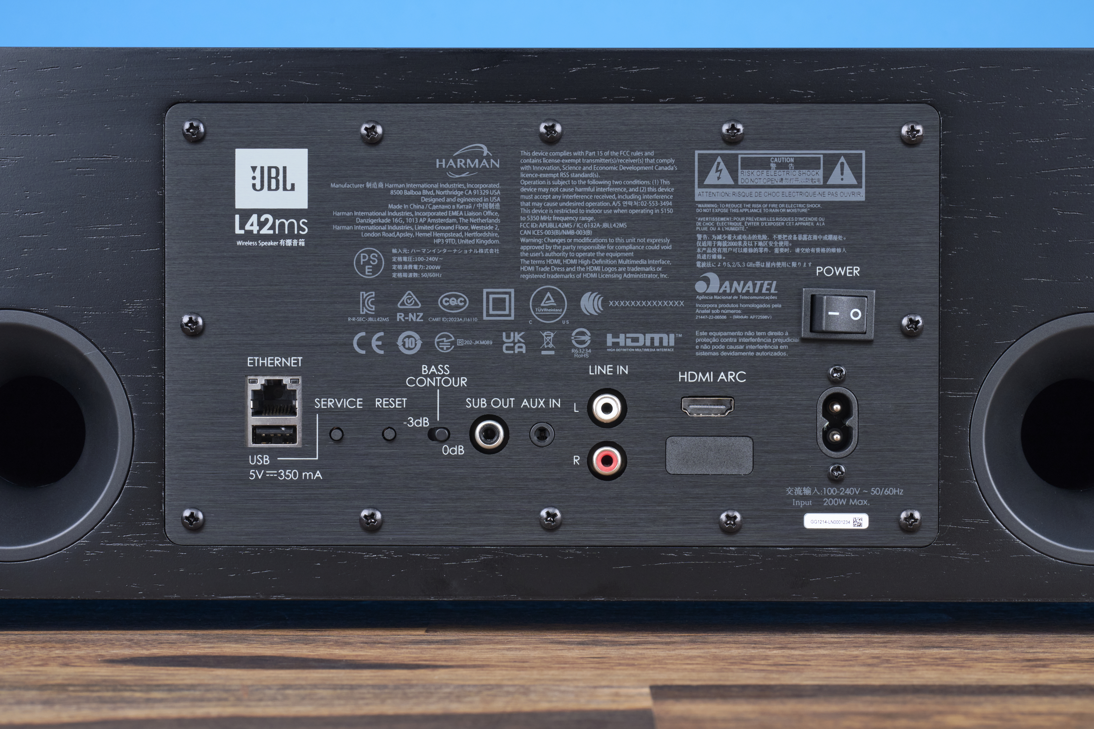 Das Anschlussfeld am Heck des L42ms ist übersichtlich: Euro-Netzbuchse und „harter“ Netzschalter stellen die Stromversorgung sicher und erlauben, den JBL bei längerer Abwesenheit vom Netz zu trennen. Direkt daneben sitzt der – nach dem Strom – zweitwichtigste Eingang des L42: eine HDMI-ARC-Buchse, die Ton und Steuerbefehle von deinem TV entgegennimmt. So kann der All-In-One mit vollem Komfort auch als Soundbar dienen. Weitere physische Digitaleingänge gibt es nicht, dafür aber zwei analoge Türchen, eines in Cinch- und eines in Miniklinke-Ausführung. Ersteres würde sich zum Beispiel zum Anschluss eines Plattenspielers samt Phono-Vorverstärker anbieten.