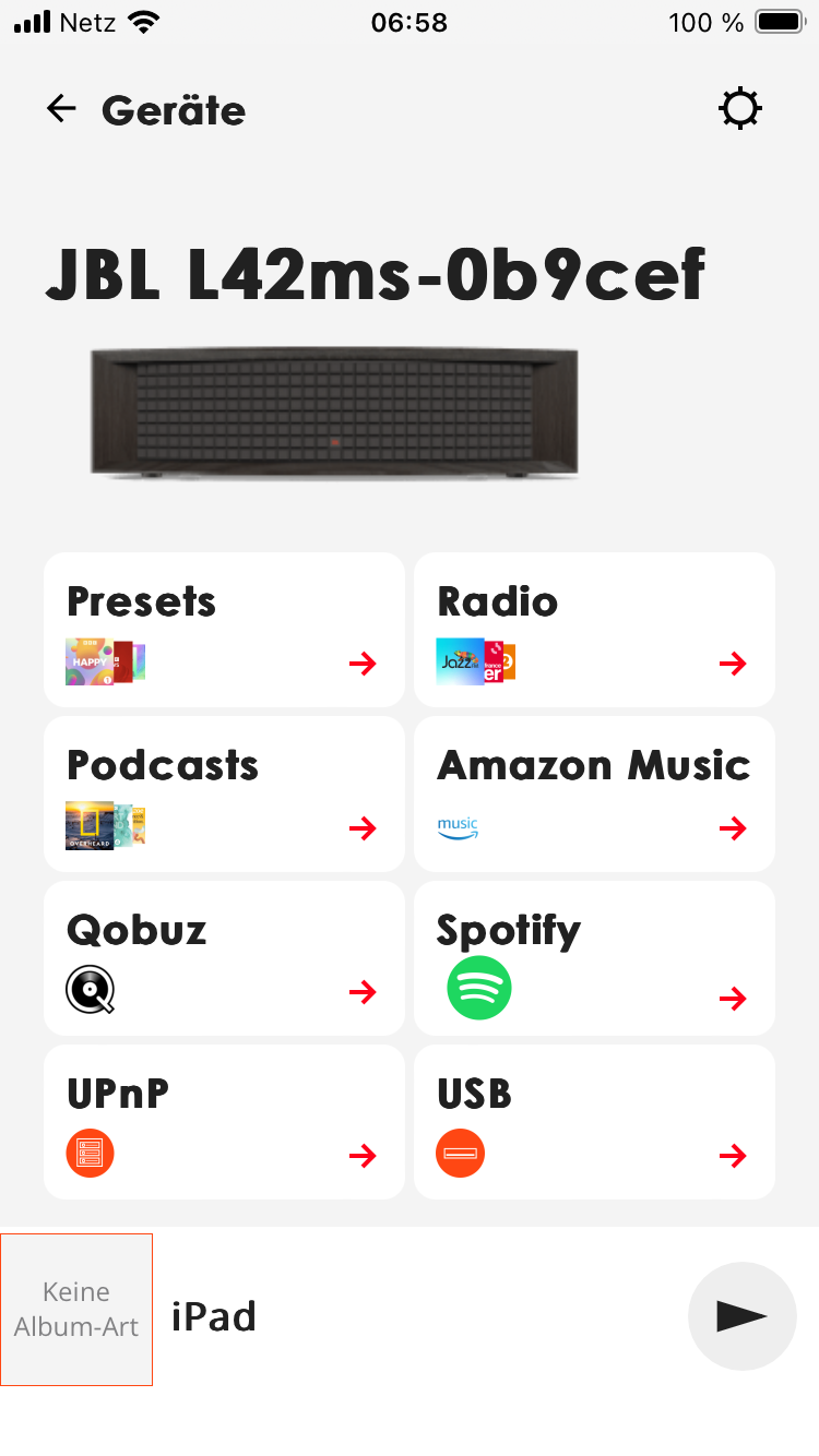 Um Content auszusuchen – vom Webradiosender bis zu Highres-Album von deinem UPnP-Server – musst du mangels Display am Gerät auf jeden Fall zum JBL-App greifen. Das funktioniert nicht besonders rasant oder optionenreich, dafür aber zuverlässig.